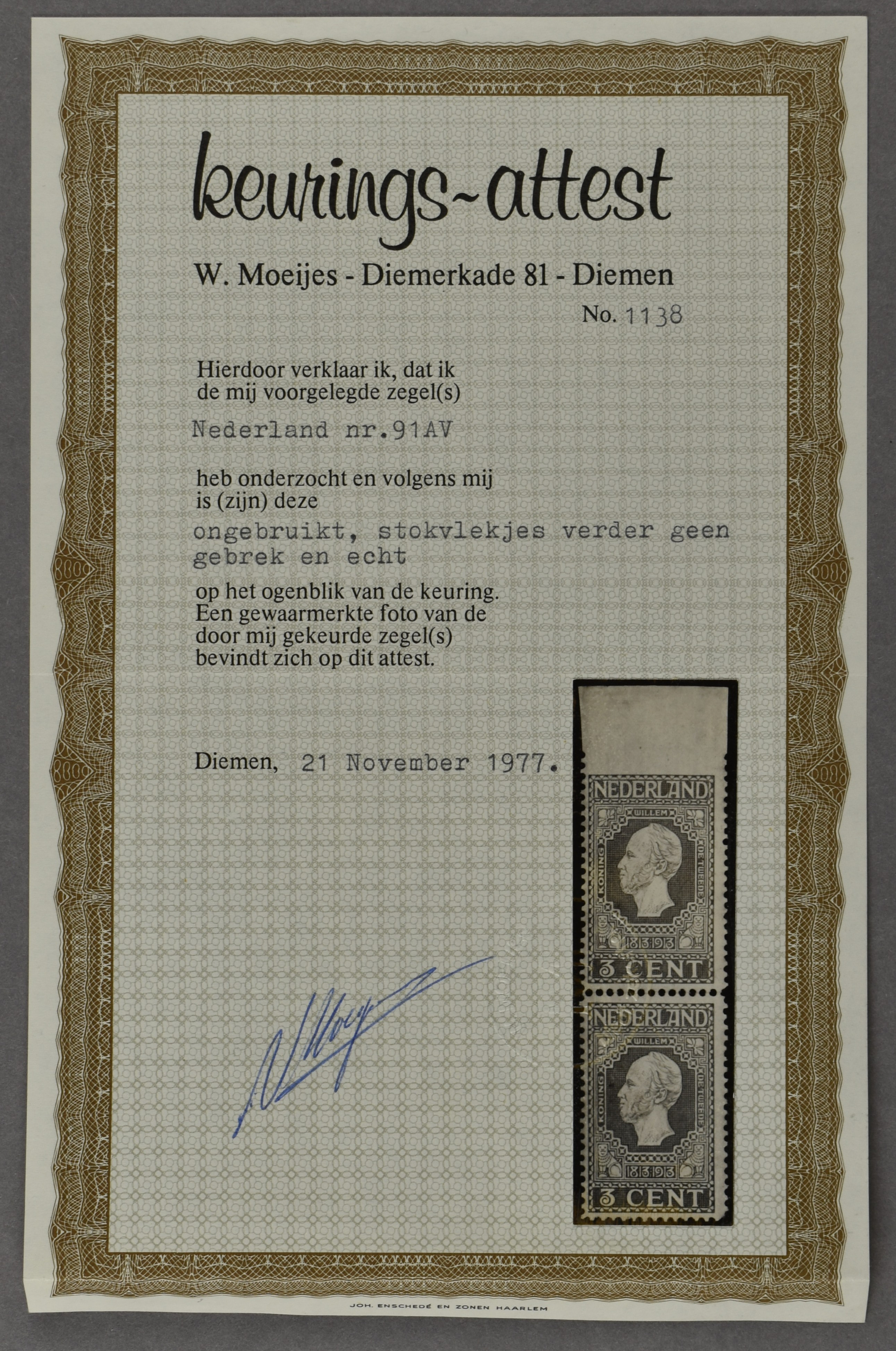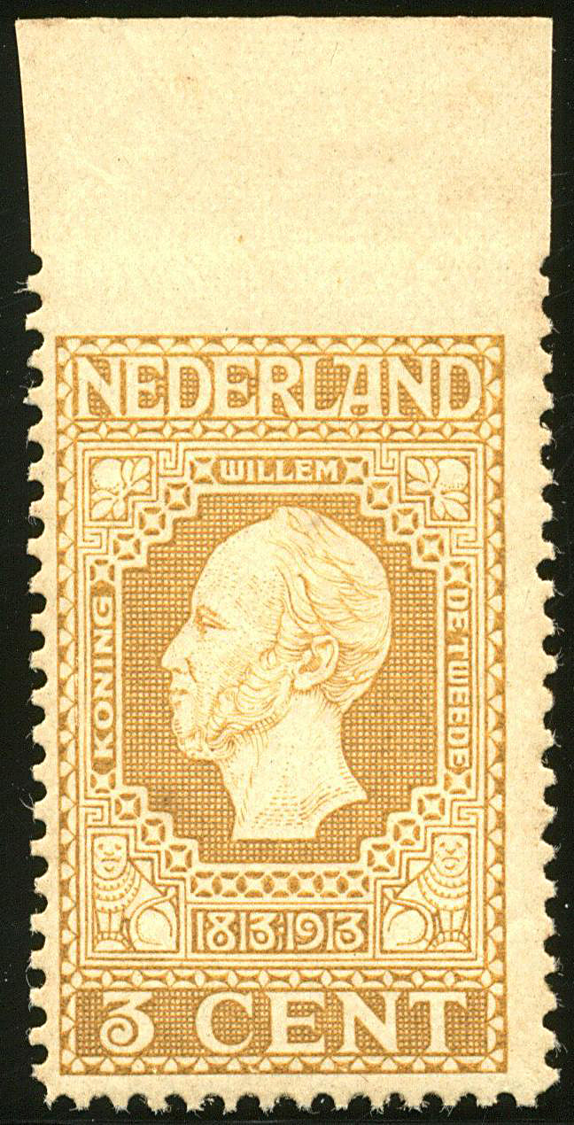 91Av, 3 cent bruingeel op roomkleur, Lt. 11½ x 11, met variëteit: bovenzijde ongeperforeerd, beh. enkele stockvlekjes en iets getinte gom, een ongebruikt zeer fraai ex. met certificaat Moeijes (1977) € 2000 (Image) (Image2)