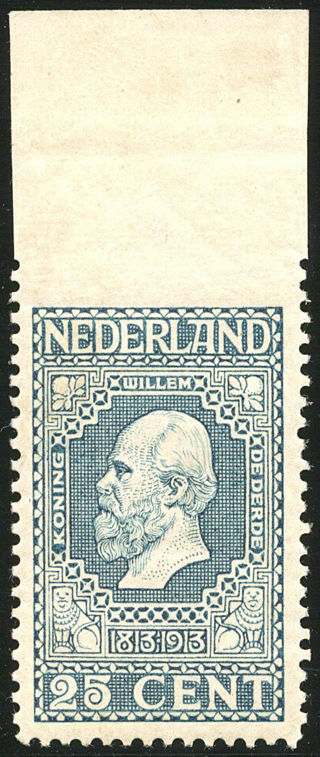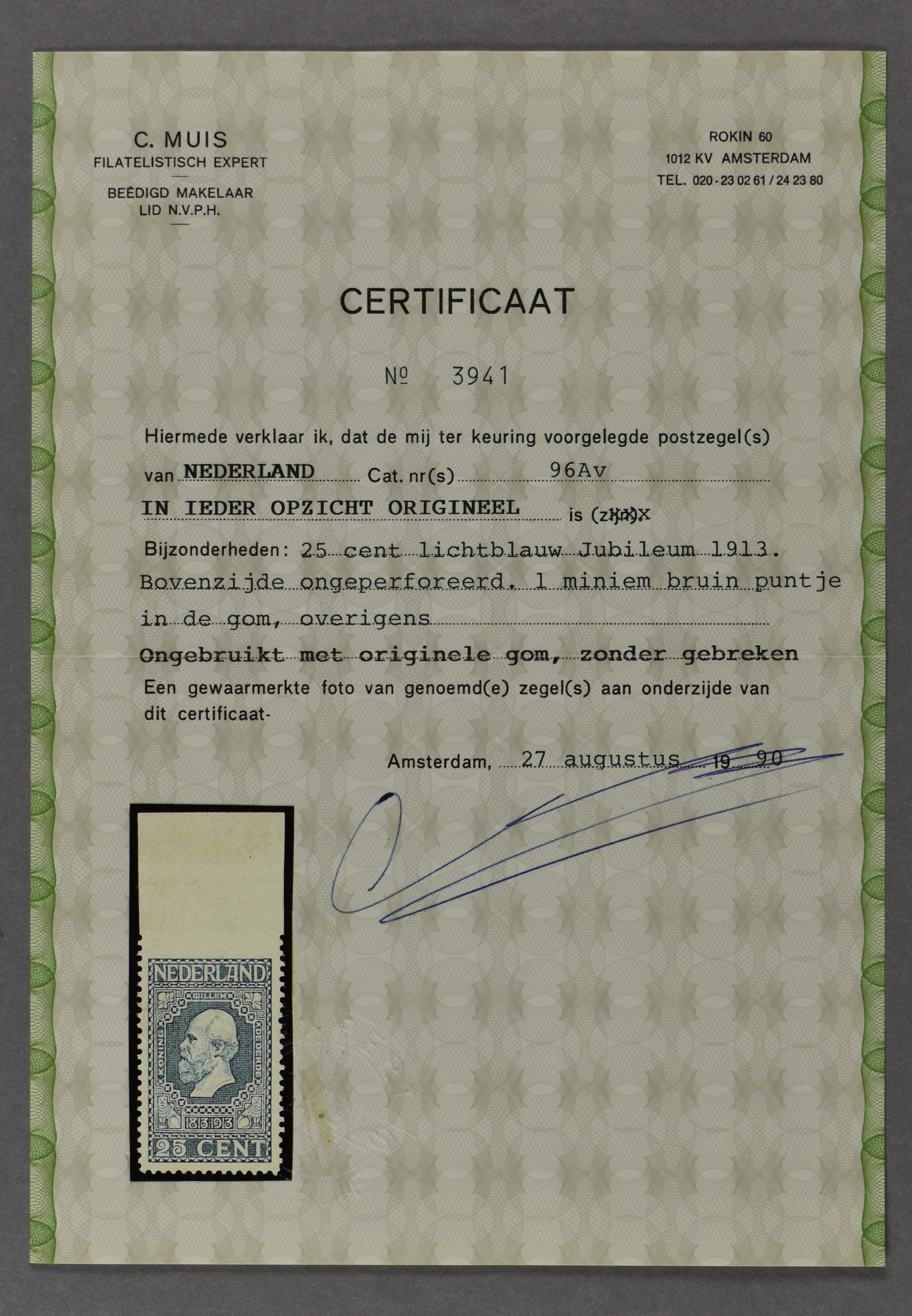 96Av, 25 cent lichtblauw, Lt. 11½ x 11, met variëteit: bovenzijde ongeperforeerd, beh. 1 miniem bruin puntje in de gom, een ongebruikt prachtex. met certificaat Muis (1990) € 1925 (Image) (Image2)