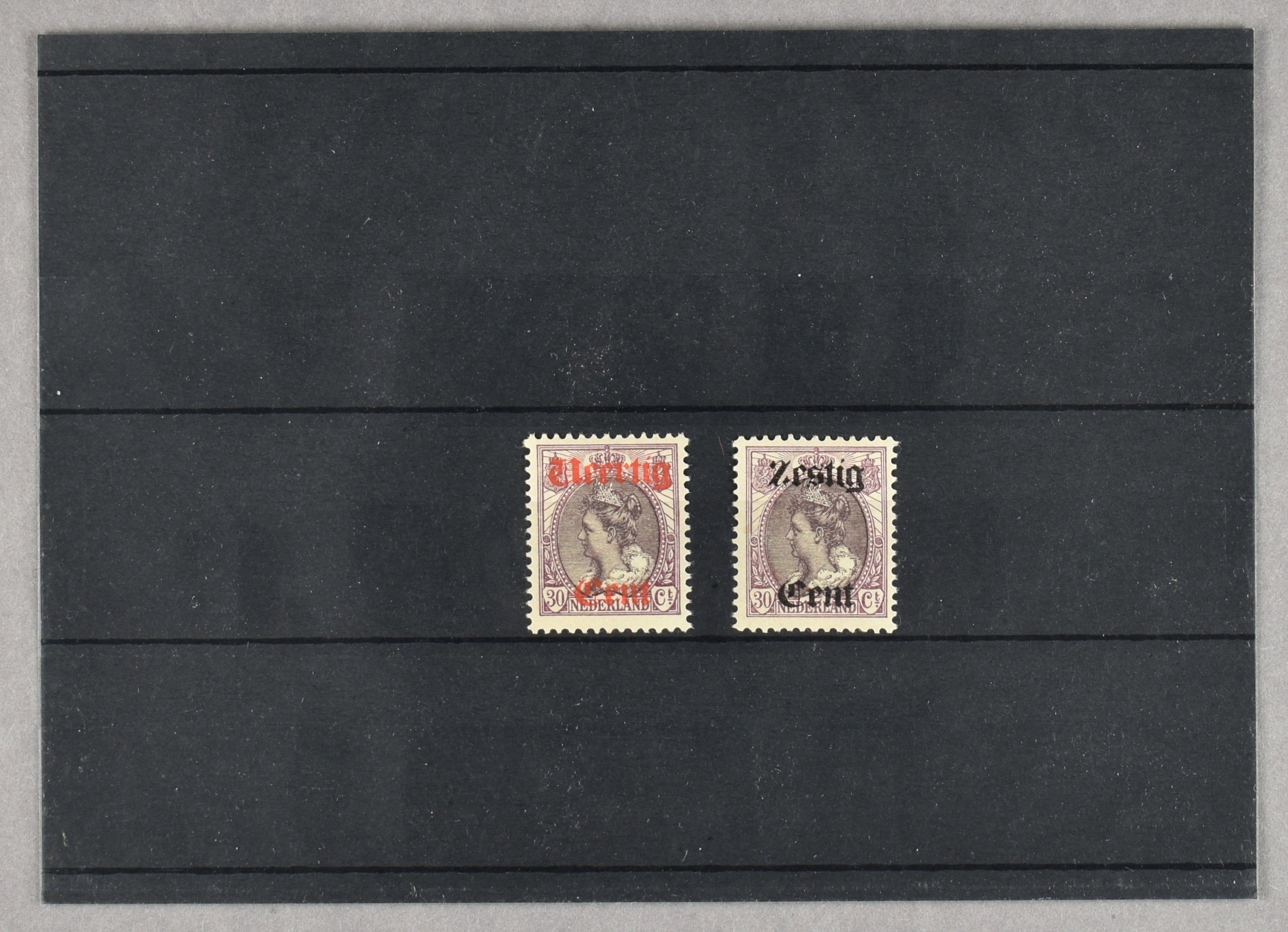 83, 10 cent met door het hulppostkantoor Borculo zelf aangebrachte naaimachinetanding als noodtanding in strip van vijf, mogelijk afgeweekt van een adreskaart voor een binnenlands postpakket, afgestempeld op 23-2-1923. Uitermate zeldzaam,
