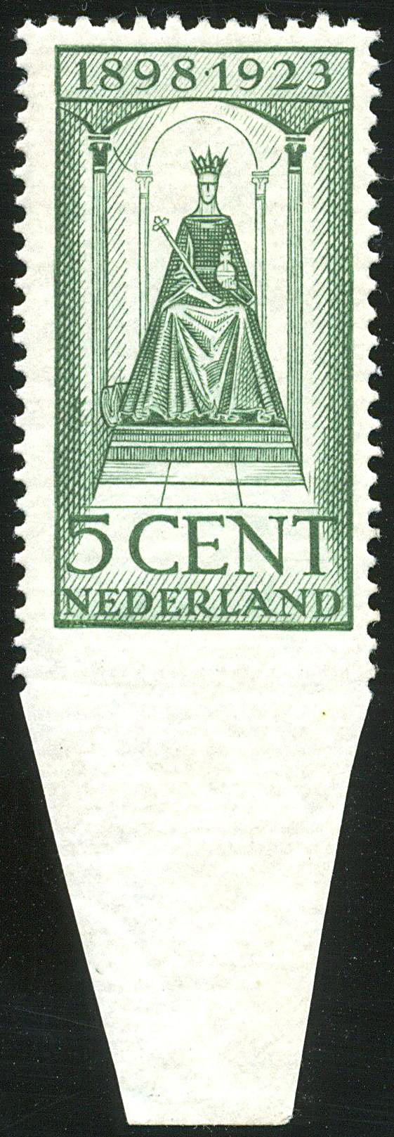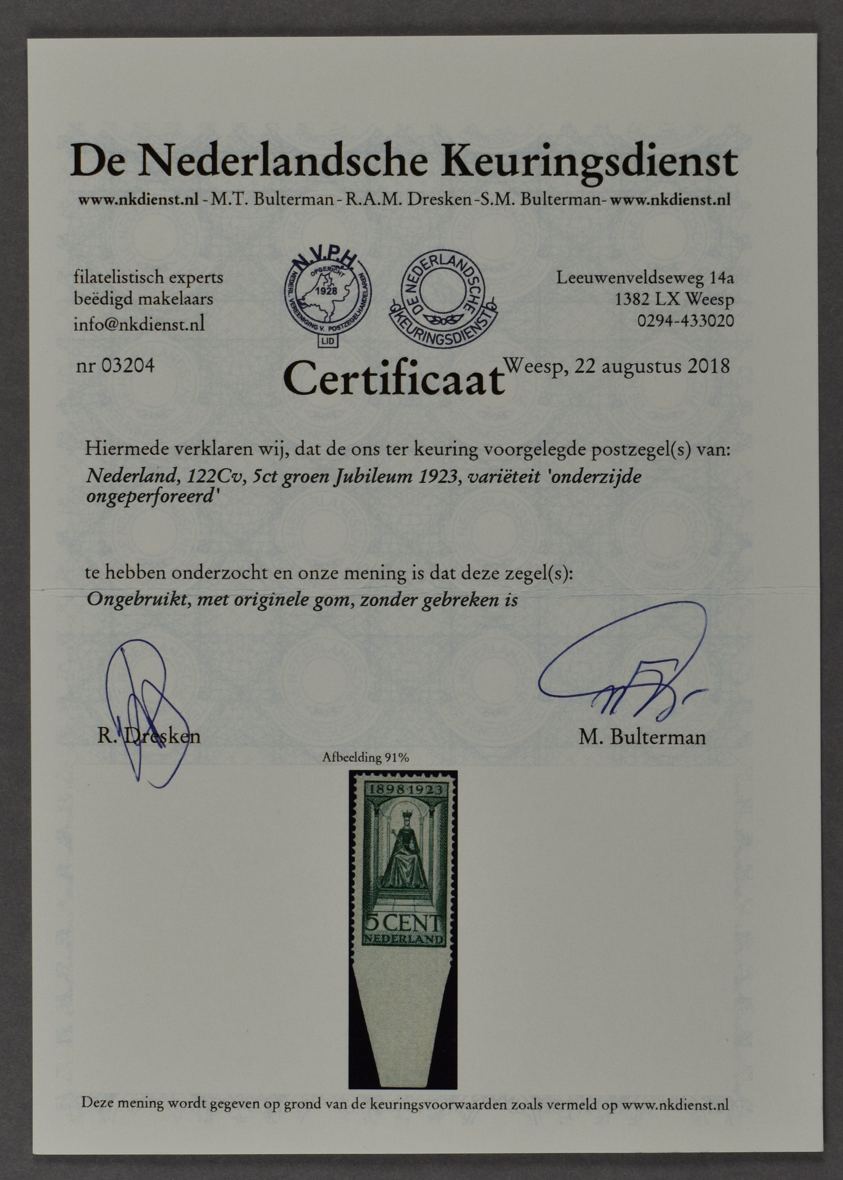 122Cv, 5 cent groen, Lt. 11 x 12, met variëteit: onderzijde ongeperforeerd, ongebruikt prachtex. met certificaat NKD (2018) € 1000 (Image) (Image2)