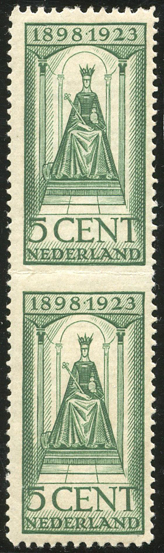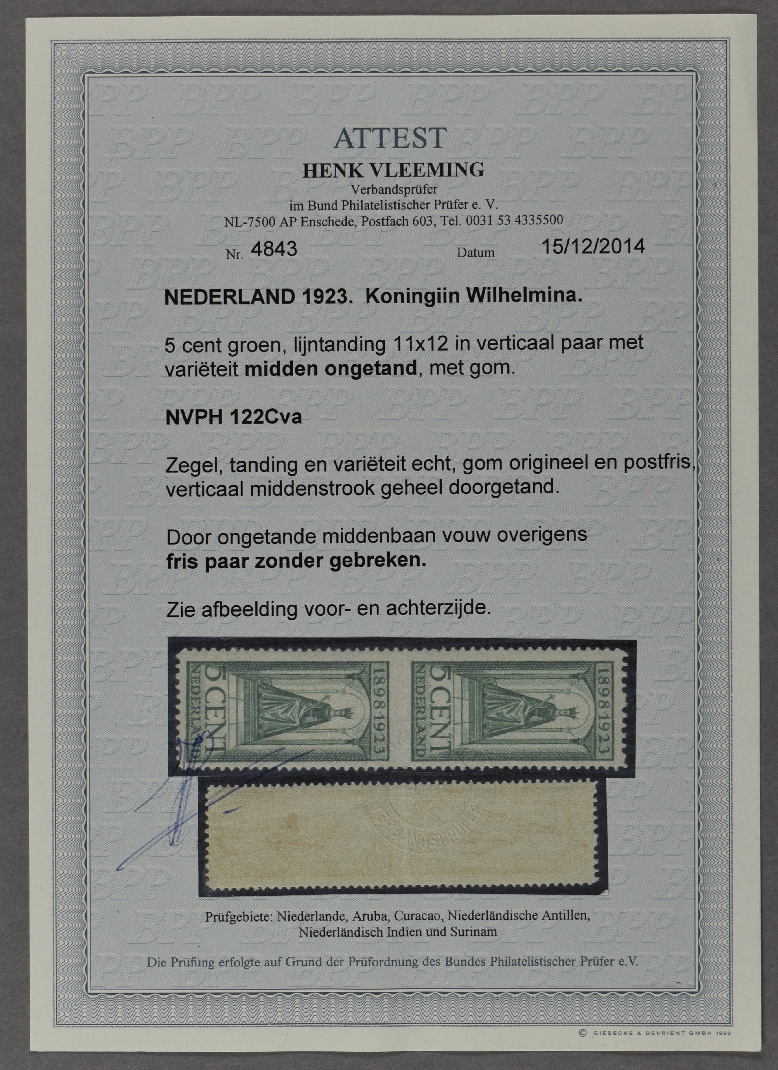 122Cva, 5 cent groen, Lt. 11 x 12, in verticaal paar met variëteit: tussen de zegels ongeperforeerd. Door de ongetande middenbaan loopt een vouw, overigens postfris zeldzaam prachtex. met certificaat Vleeming (2014) € 5000 (Image) (Image2)