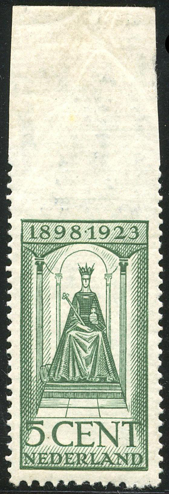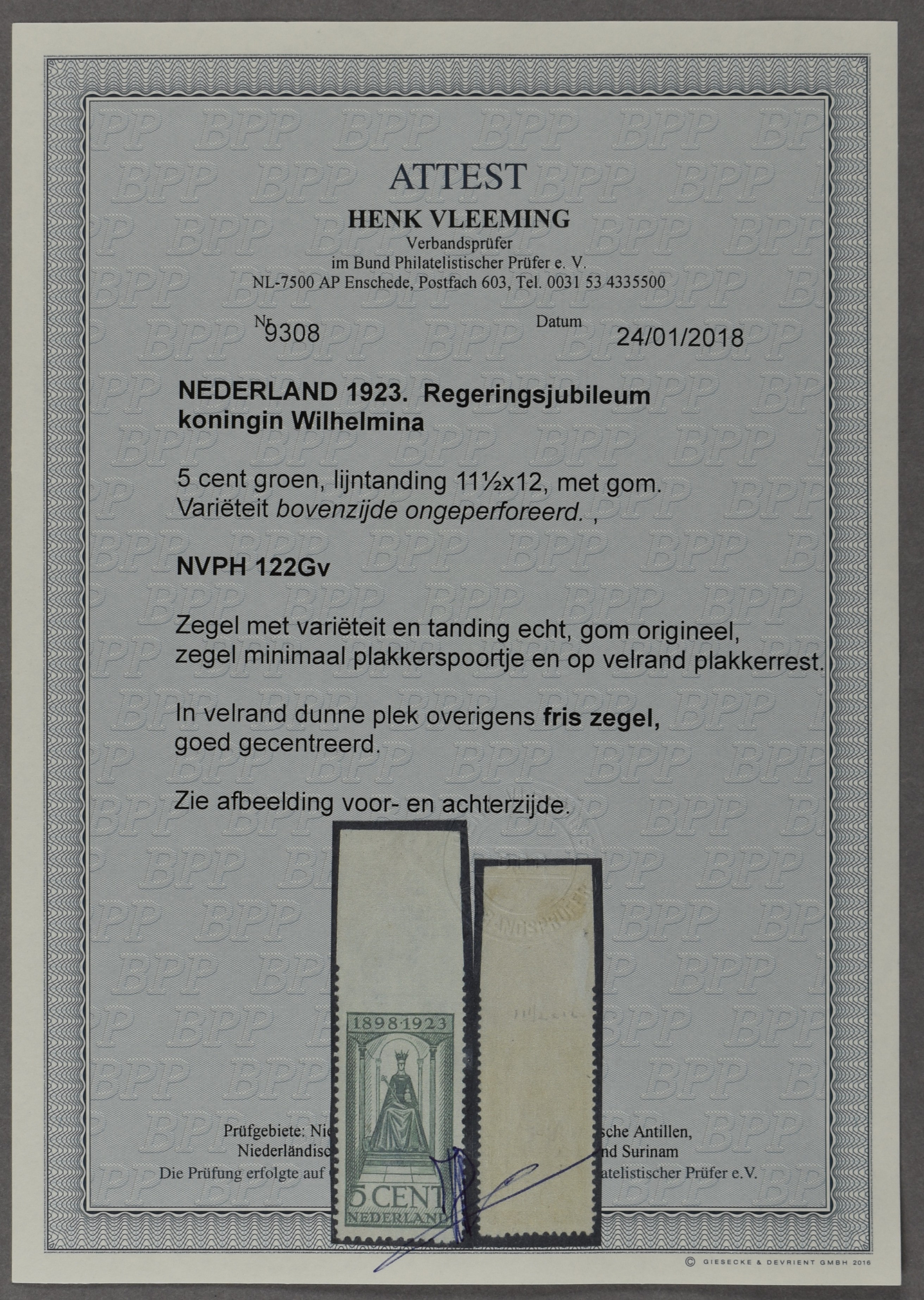 122Gv, 5 cent groen, Lt. 11½ x 12, met variëteit: bovenzijde ongeperforeerd, ongebruikt prachtex. met certificaat Vleeming (2018) € 550 (Image) (Image2)