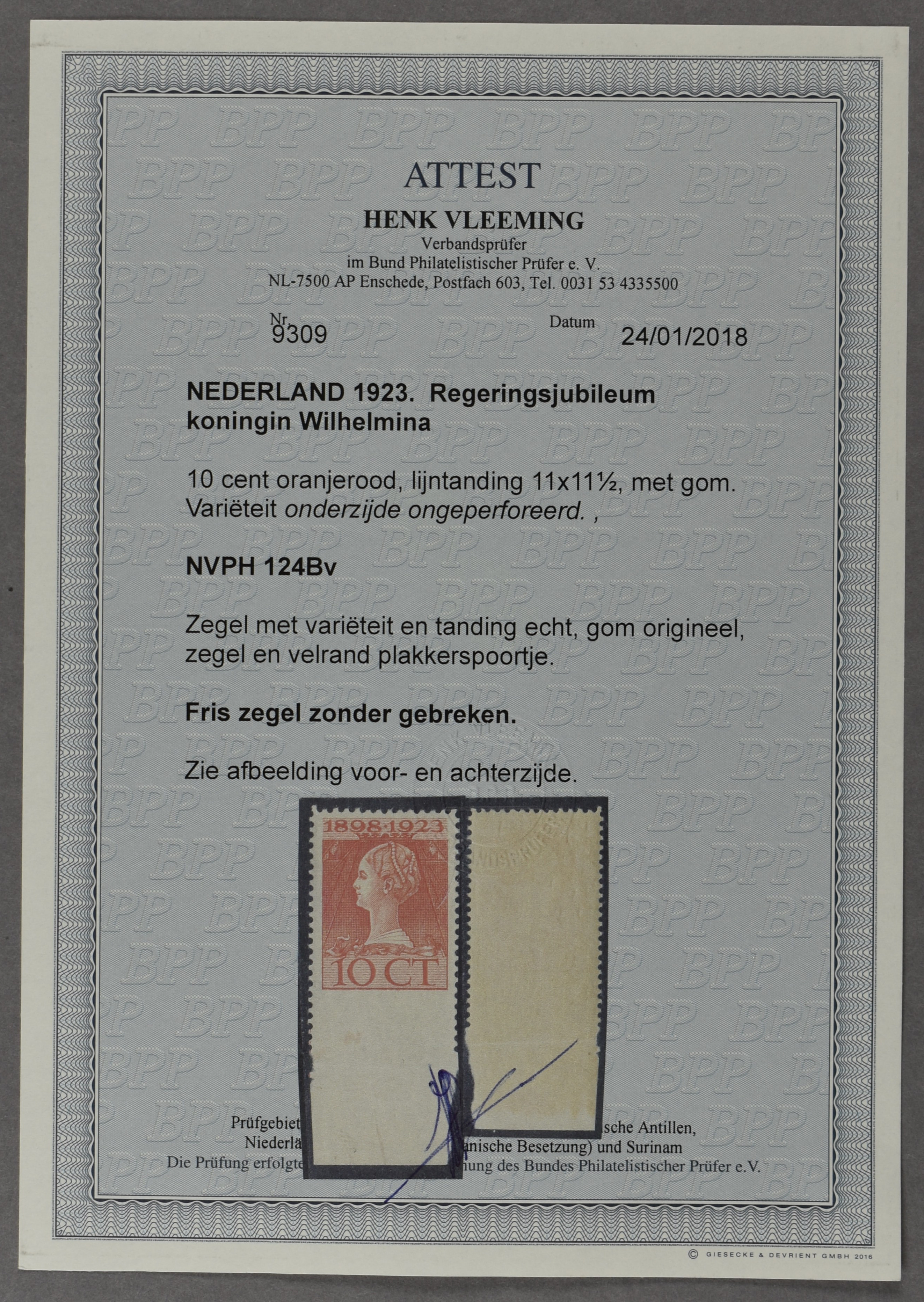 124Bv, 10 cent rood, Lt. 11 x 11½, met variëteit: onderzijde ongeperforeerd, ongebruikt prachtex. met certificaat Vleeming (2018) € 400 (Image) (Image2)