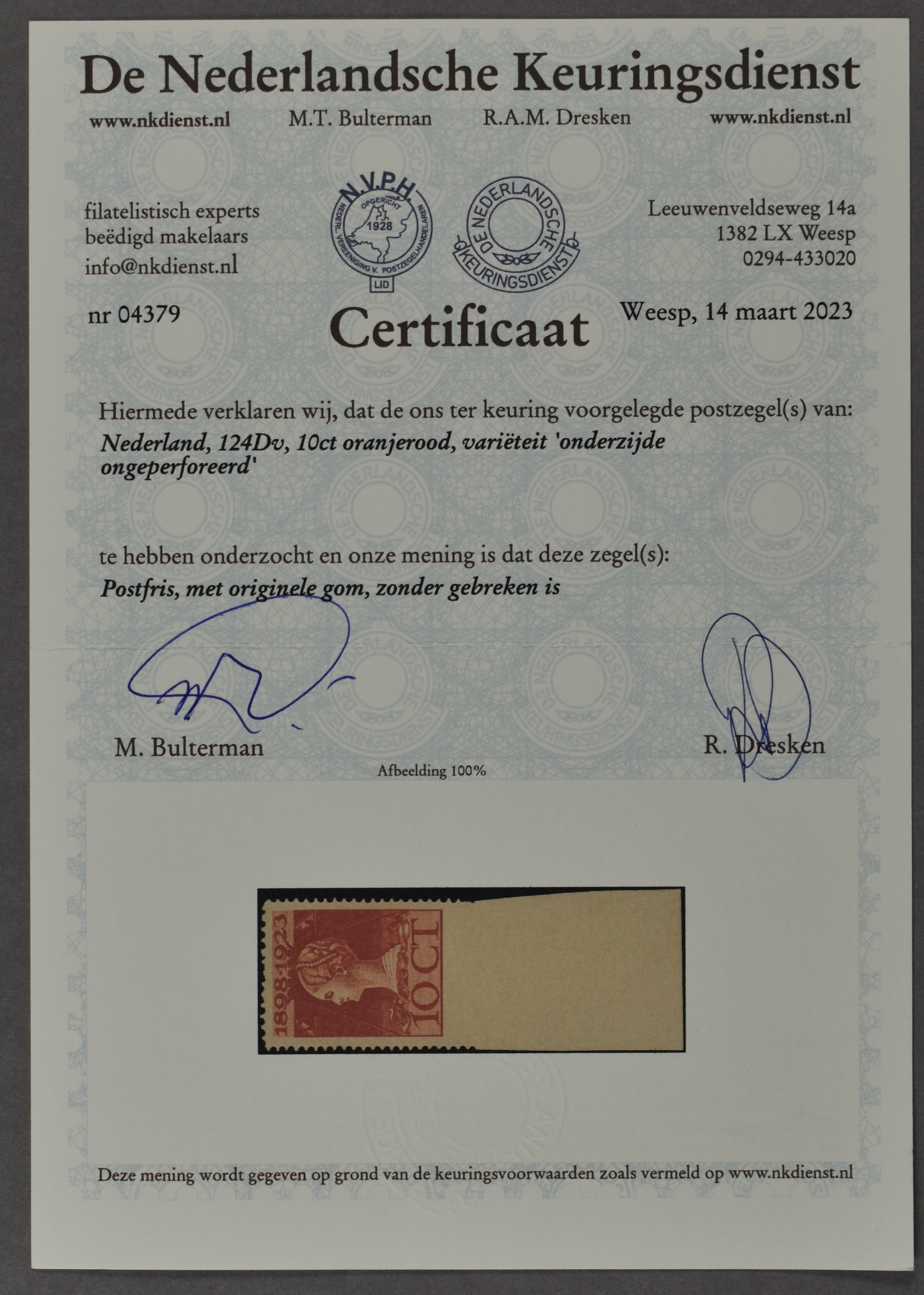 124Gv, 10 cent rood, Lt. 11½ x 12, met variëteit: bovenzijde ongeperforeerd, ongebruikt prachtex. met certificaat NKD (2018) € 1000 (Image)