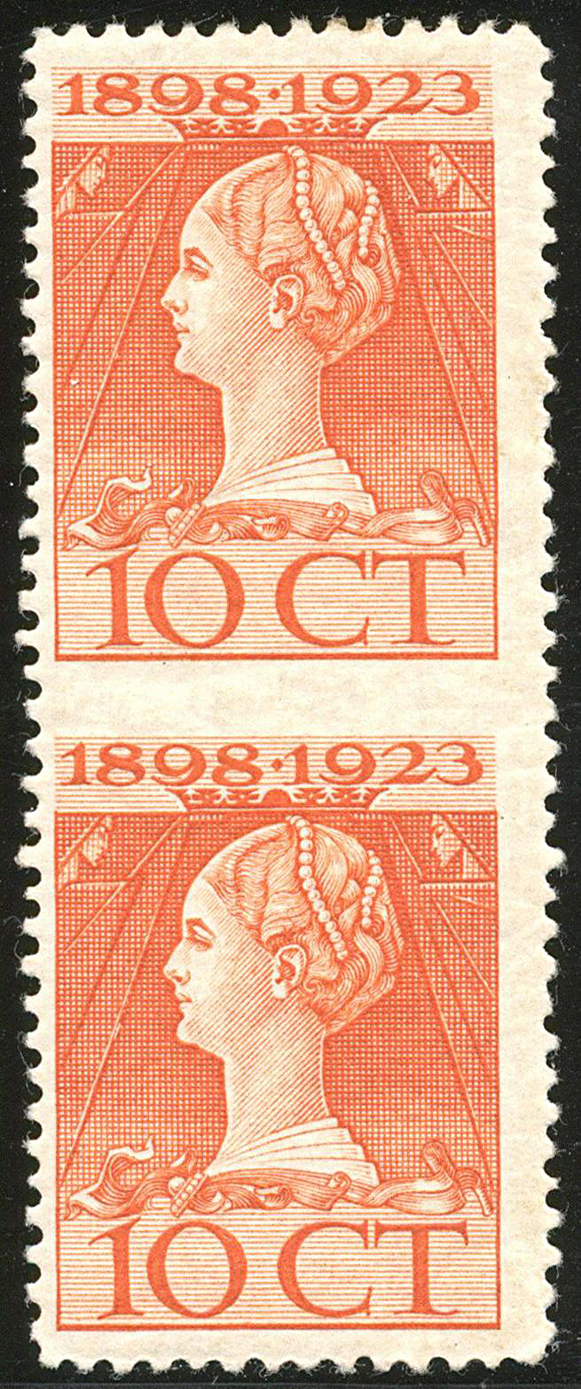 124Gva, 10 cent rood, Lt. 11½ x 12, in verticaal paar, met variëteit: tussen de zegels ongeperforeerd, ongebruikt prachtex. met certificaat Vleeming (2018) € 750 (Image)