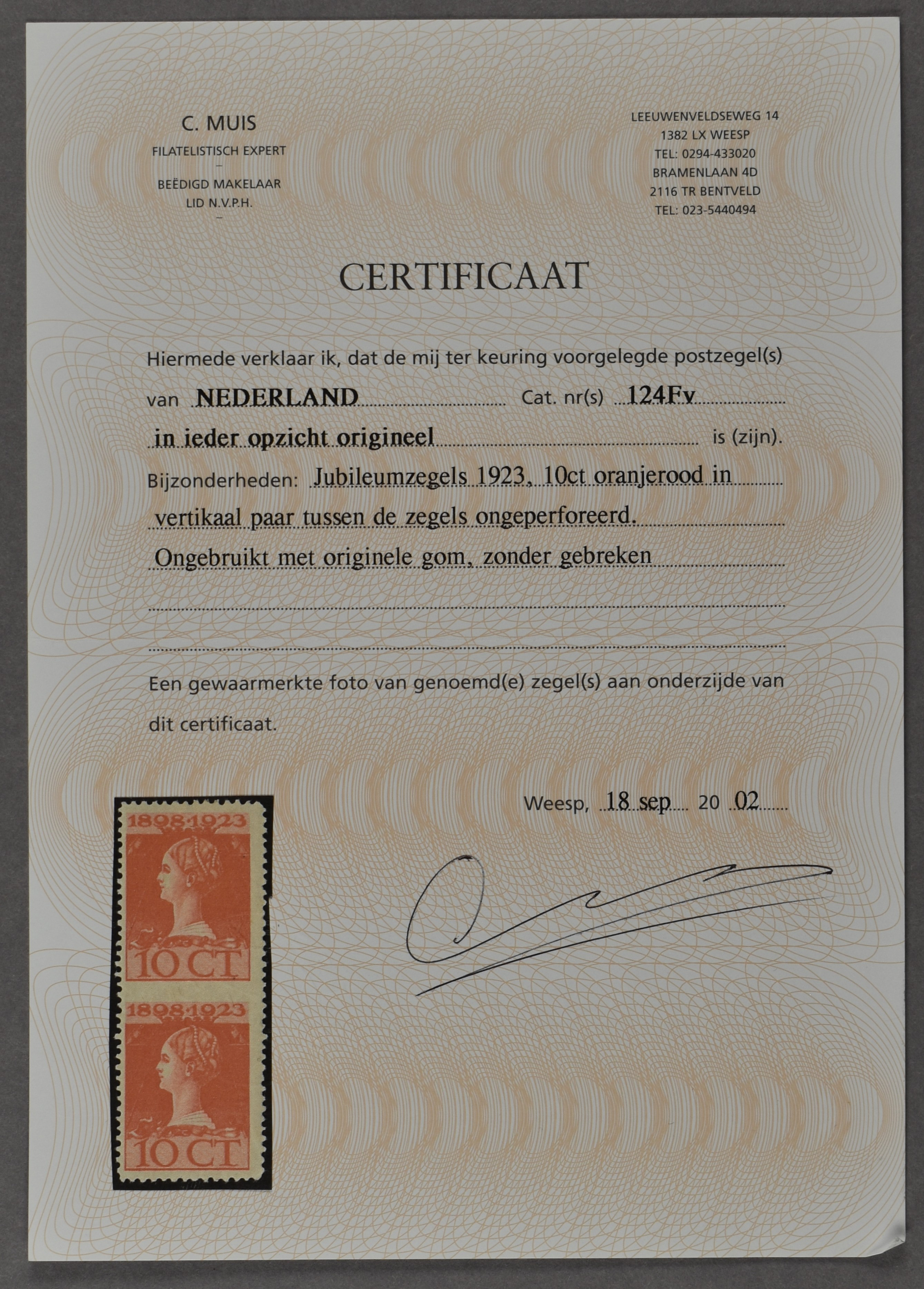 124Fv, 10 cent rood, Lt. 11½, in verticaal paar met variëteit: tussen de zegels ongeperforeerd, ongebruikt prachtex. met certificaat Muis (2002) € 725