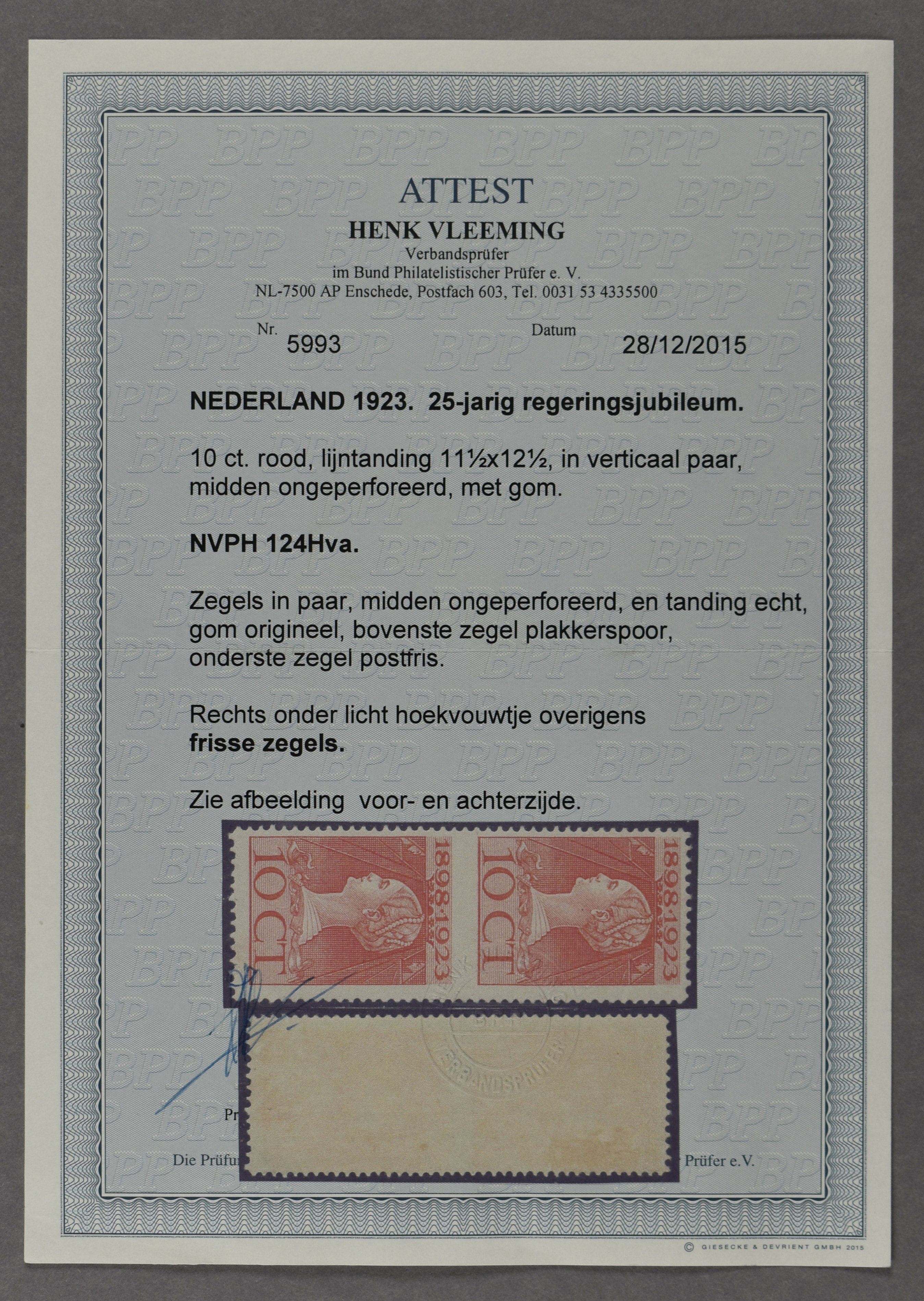 124Hva, 10 cent rood, Lt. 11½ x 12½, in verticaal paar, met variëteit: tussen de zegels ongeperforeerd, beh. licht hoekvouwtje, een ongebruikt prachtex. met certificaat Vleeming (2015) € 750 (Image)