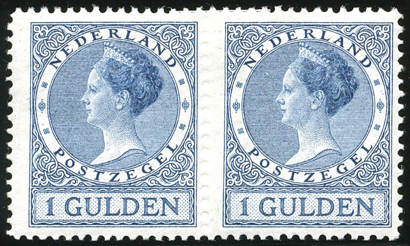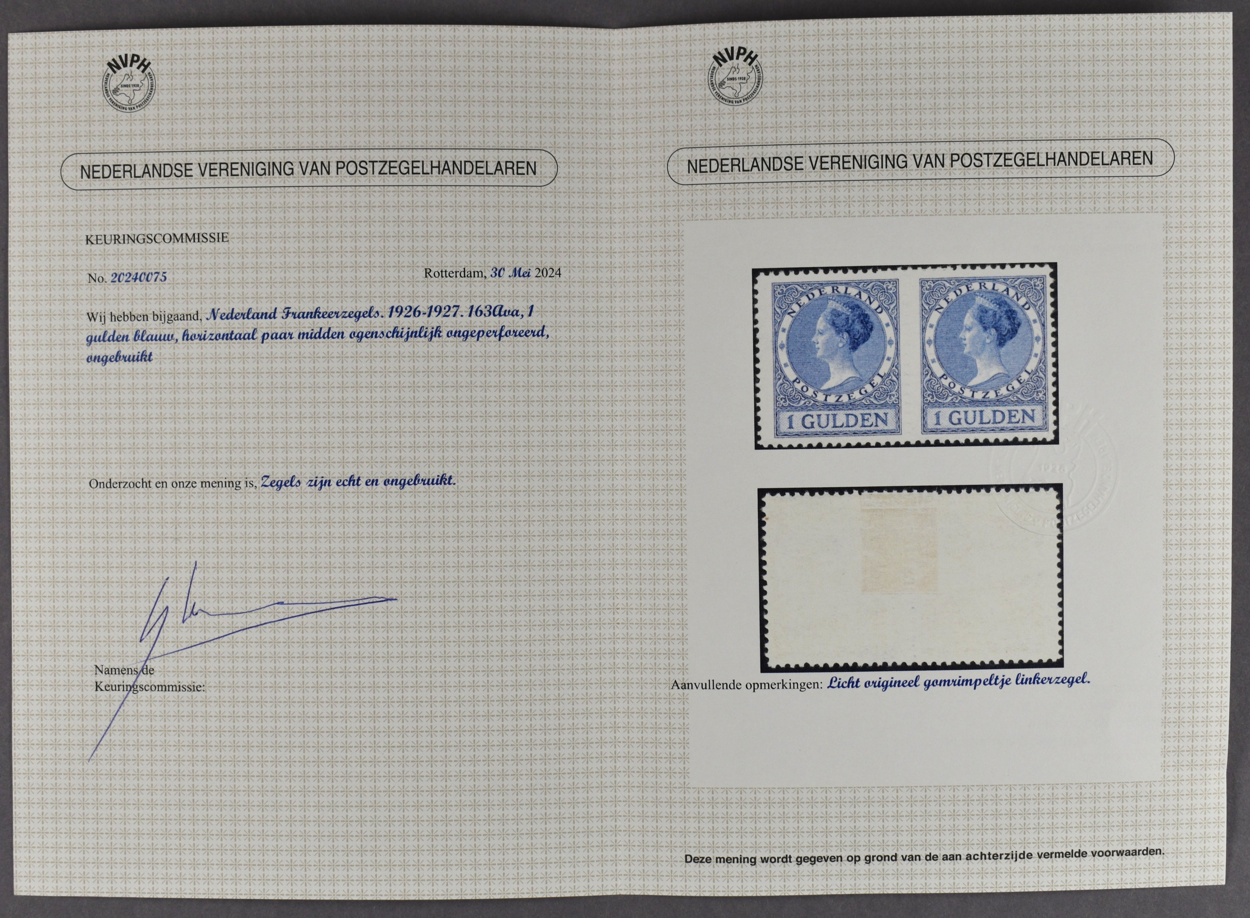 163Ava, 1 gulden blauw in horizontaal paar, met variëteit: tussen de zegels ogenschijnlijk ongeperforeerd, ongebruikt prachtex. met certificaat NVPH (2024) € 2500 (Image) (Image2)