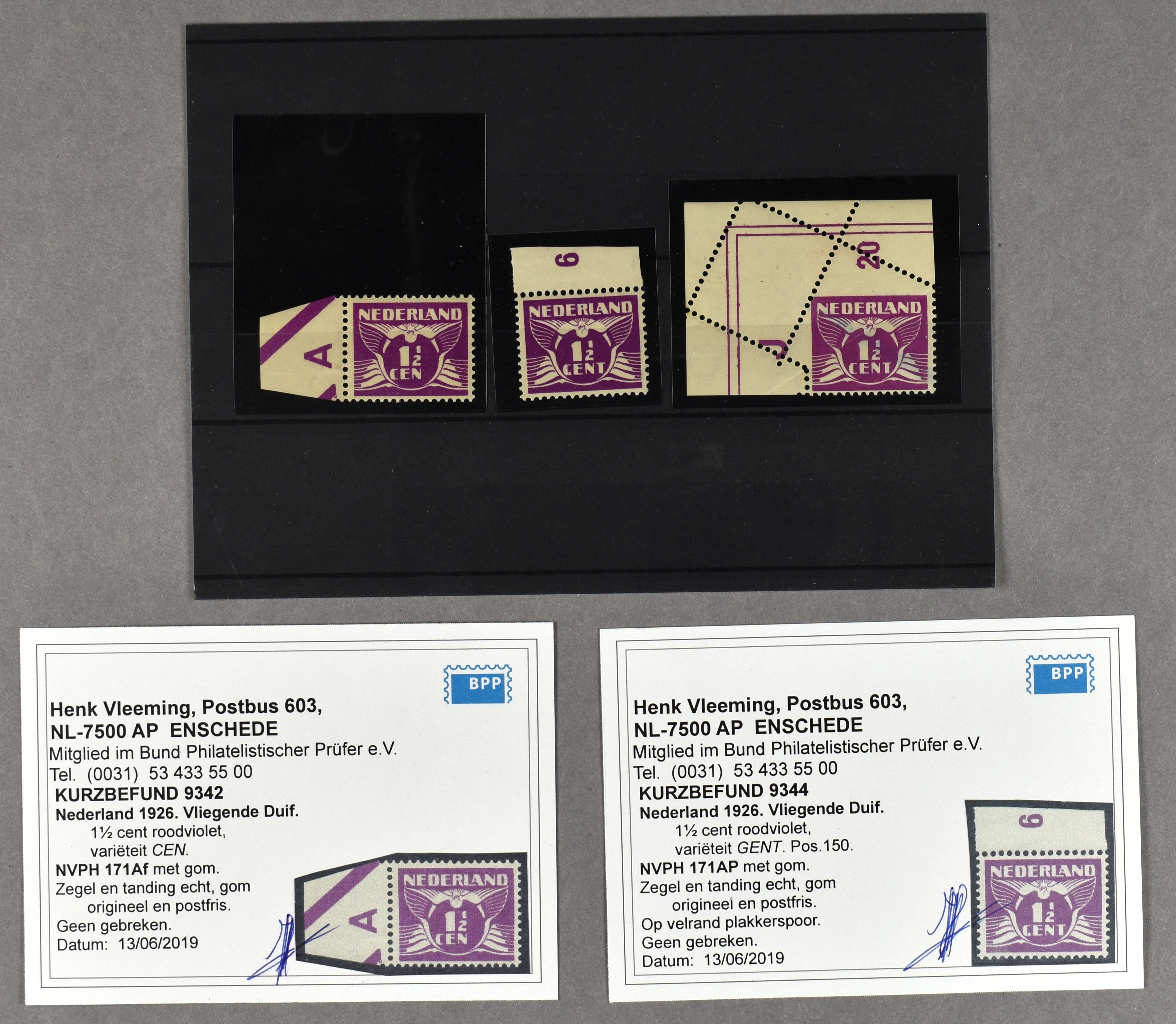 171var., 1½ cent roodviolet met de variëteiten: CEN (171Af), Gent (171AP) alsmede 1 exemplaar met hoekvelrand met volledige misperforatie. Alle postfrisse prachtex. en met 2 attesten Vleeming (2019) Tax. € 150 (Image) (Image2)