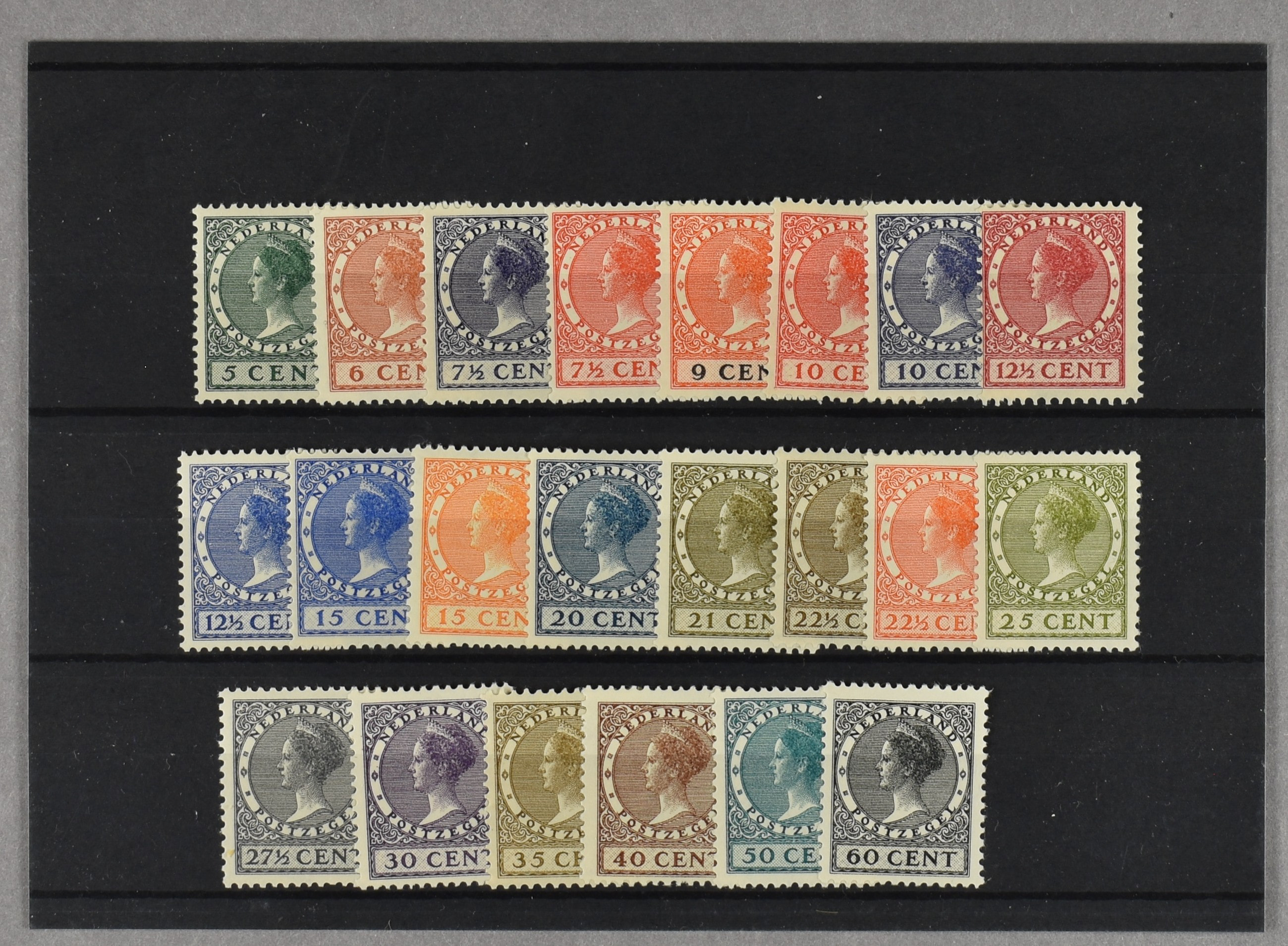 144 t/m 165, Vliegende duif en koningin Wilhelmina, zonder watermerk, complete postfrisse prachtex. met certificaat Vleeming (2025) € 2060 (Image)