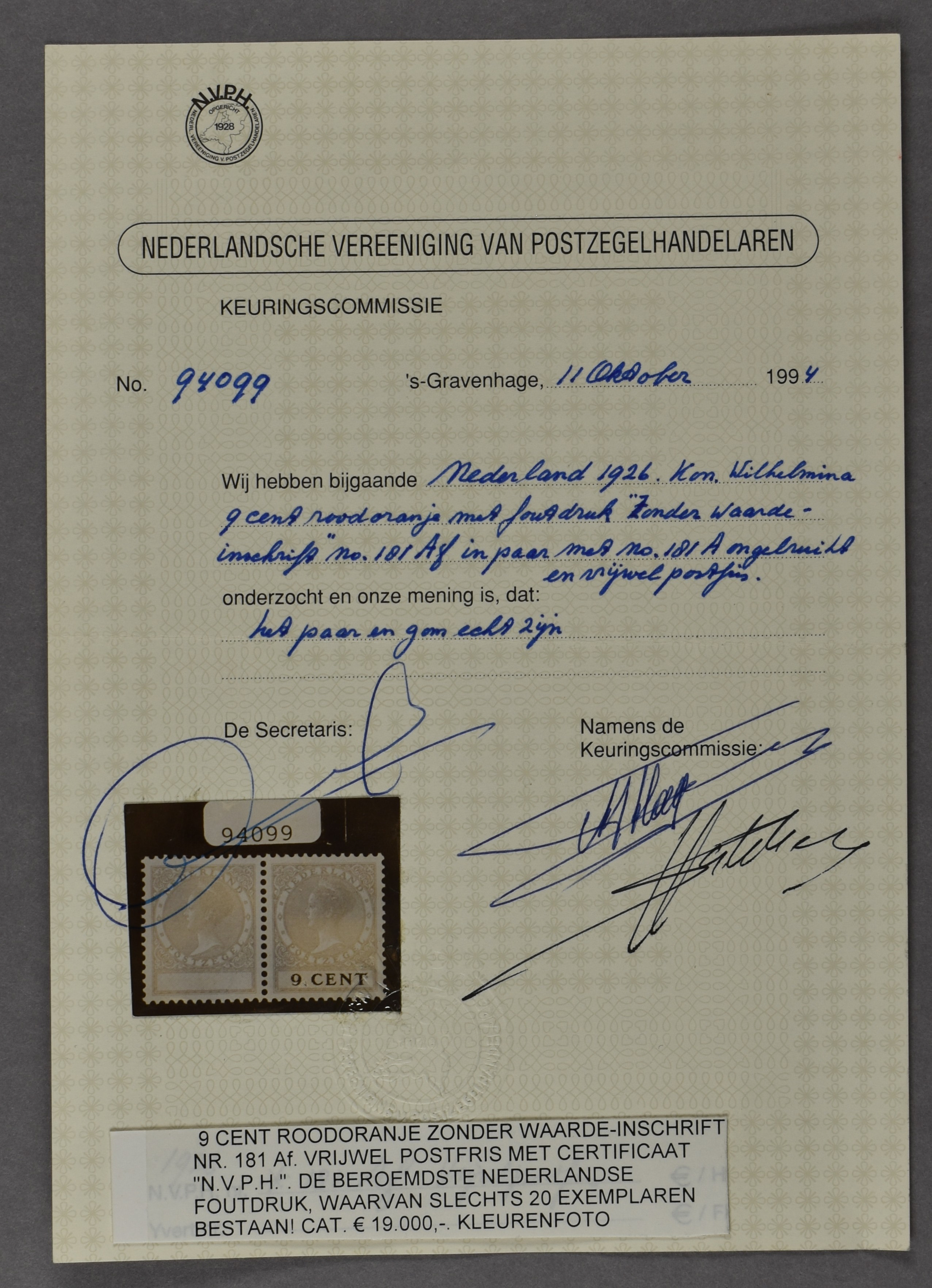 181Af, 9 cent roodoranje met foutdruk "zonder waarde-inschrift 9 cent zwart" in paar met nr. 181, uiterst zeldzaam prachtex. ongebruikt, vrijwel postfris met certificaat NVPH (1994) € 15.000 (Image) (Image2)