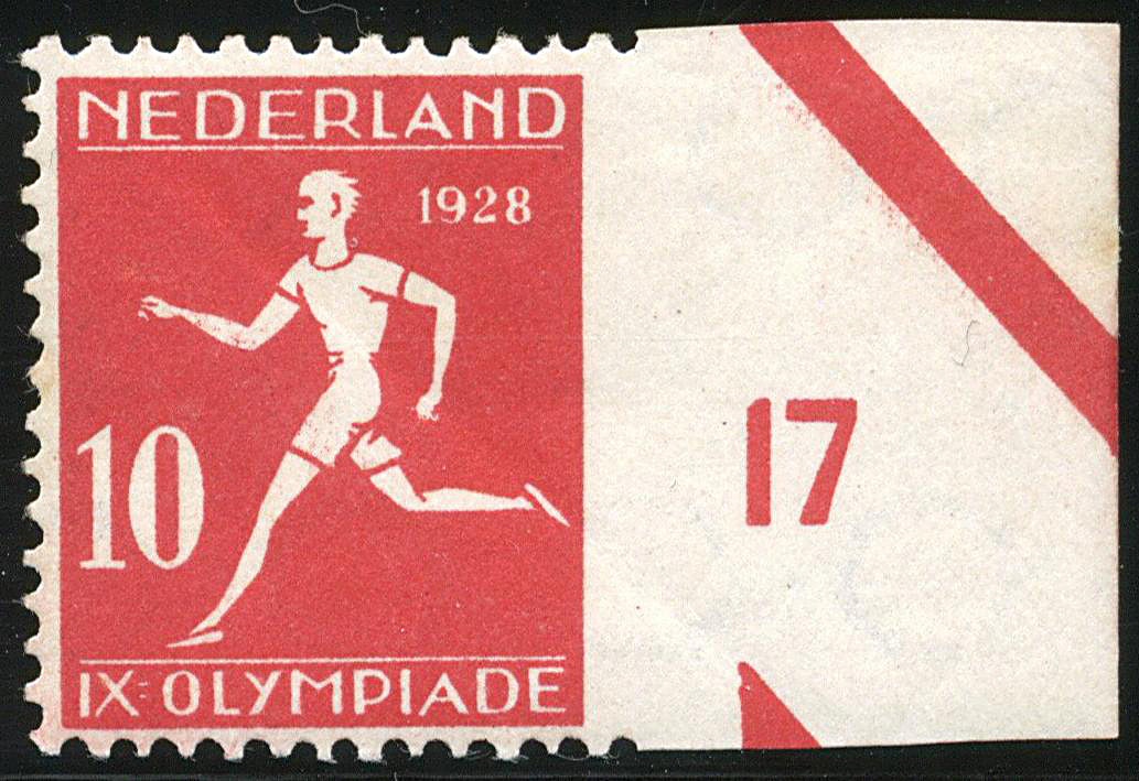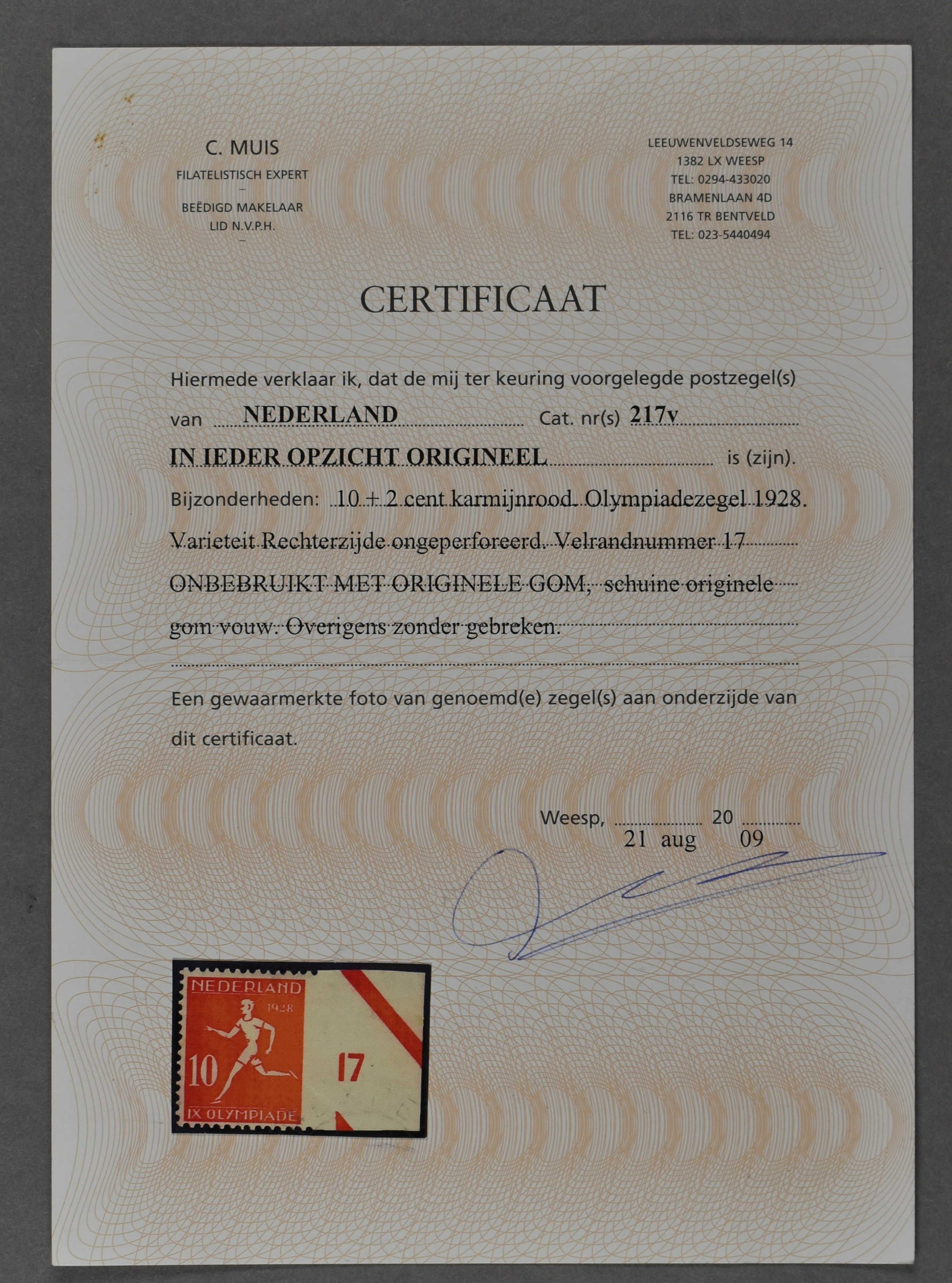 217v, 10 + 2 cent karmijnrood Olympiade 1928, met variëteit: rechterzijde ongeperforeerd met velrand met randnummer 17, ongebruikt, vrijwel prachtex., originele gomvouw en certificaat Muis (2009) € 1500 (Image) (Image2)
