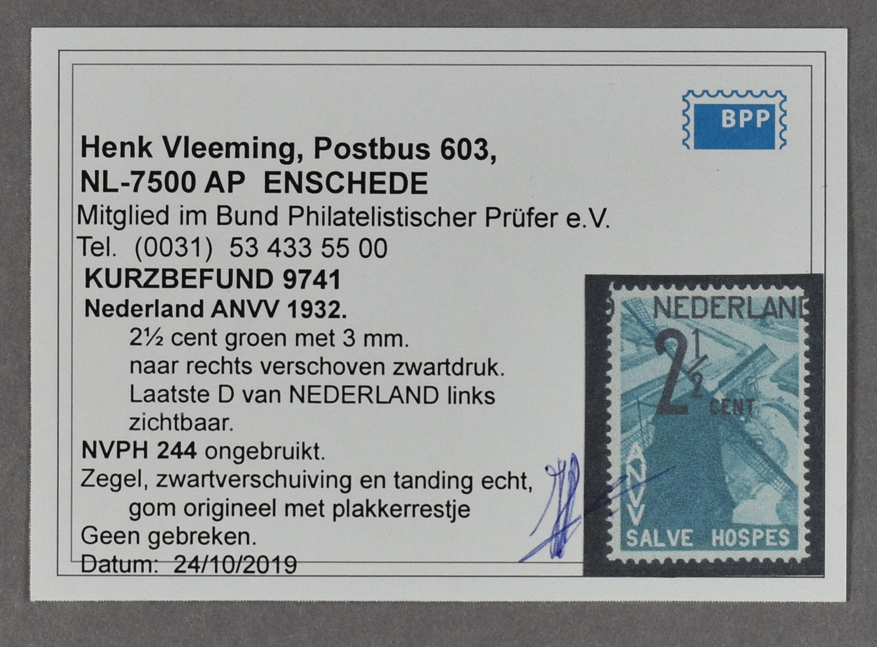 244, ANVV, 2½ cent groen, met sterk verschoven zwarte druk, zodanig dat de laatste D van Nederland aan de linkerzijde zichtbaar is. Ongebruikt prachtex. met klein attest Vleeming (2019) (Image)