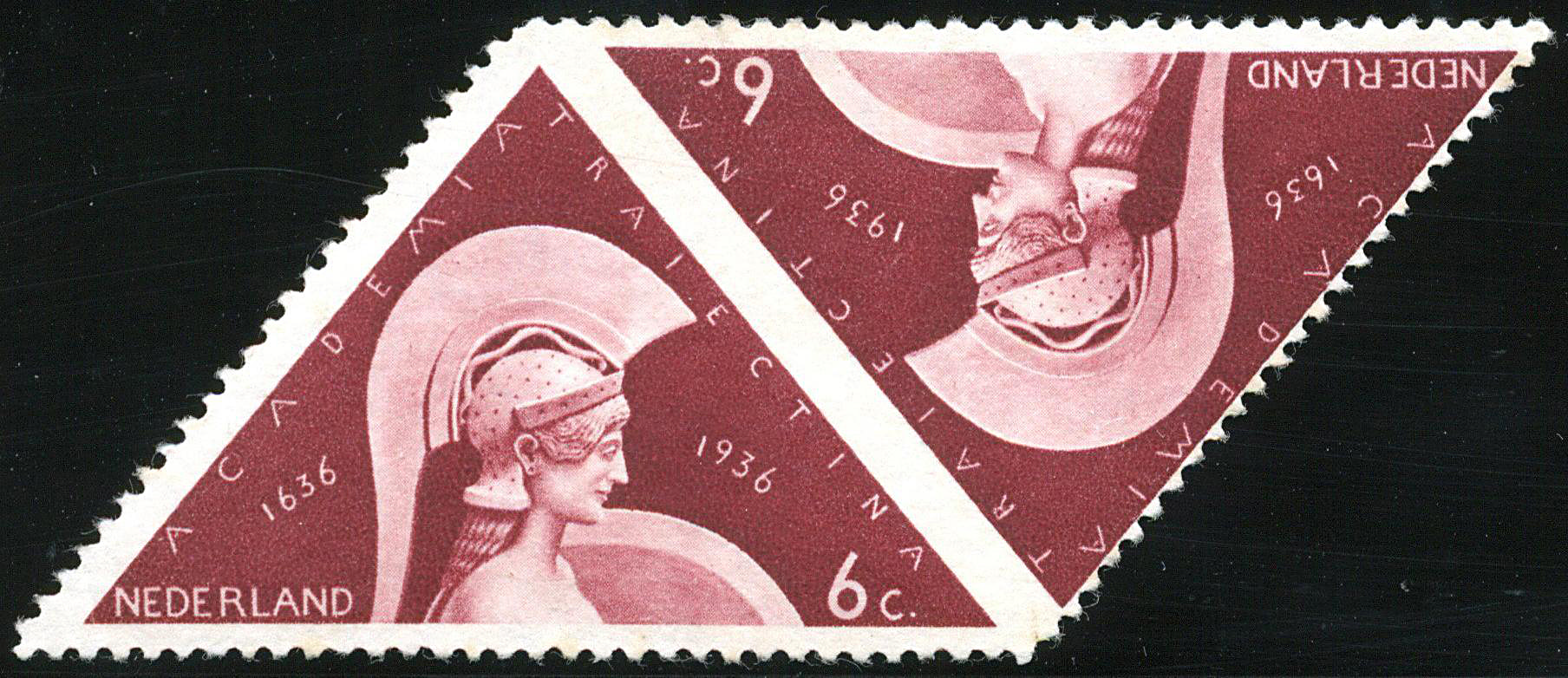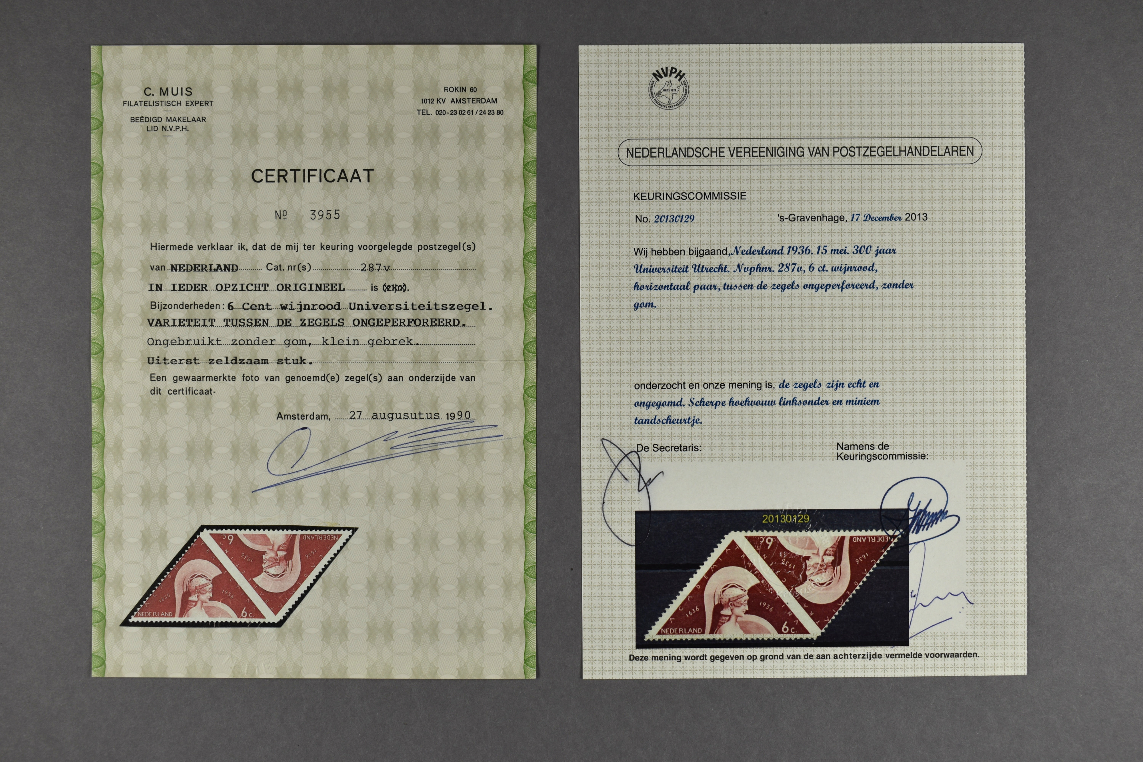 287v, 300 Jaar Universiteit van Utrecht, 6 cent wijnrood in ongebruikt verticaal paar met variëteit: tussen de zegels ongeperforeerd, zonder gom, hoekvouw en miniem tandscheurtje, ov. zeer zeldzaam ex. met certificaat NVPH (2013)