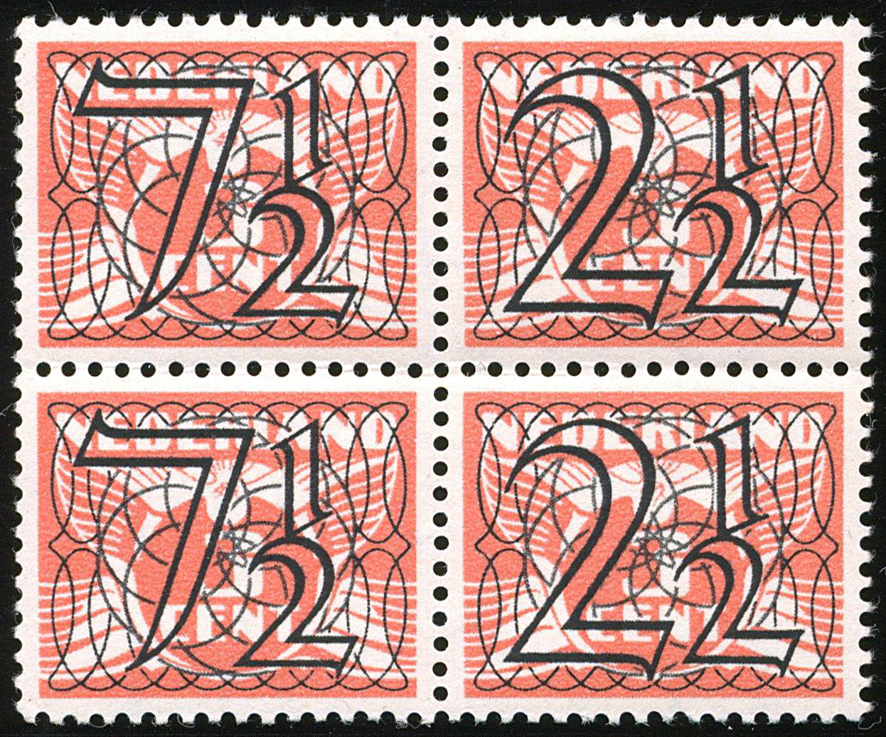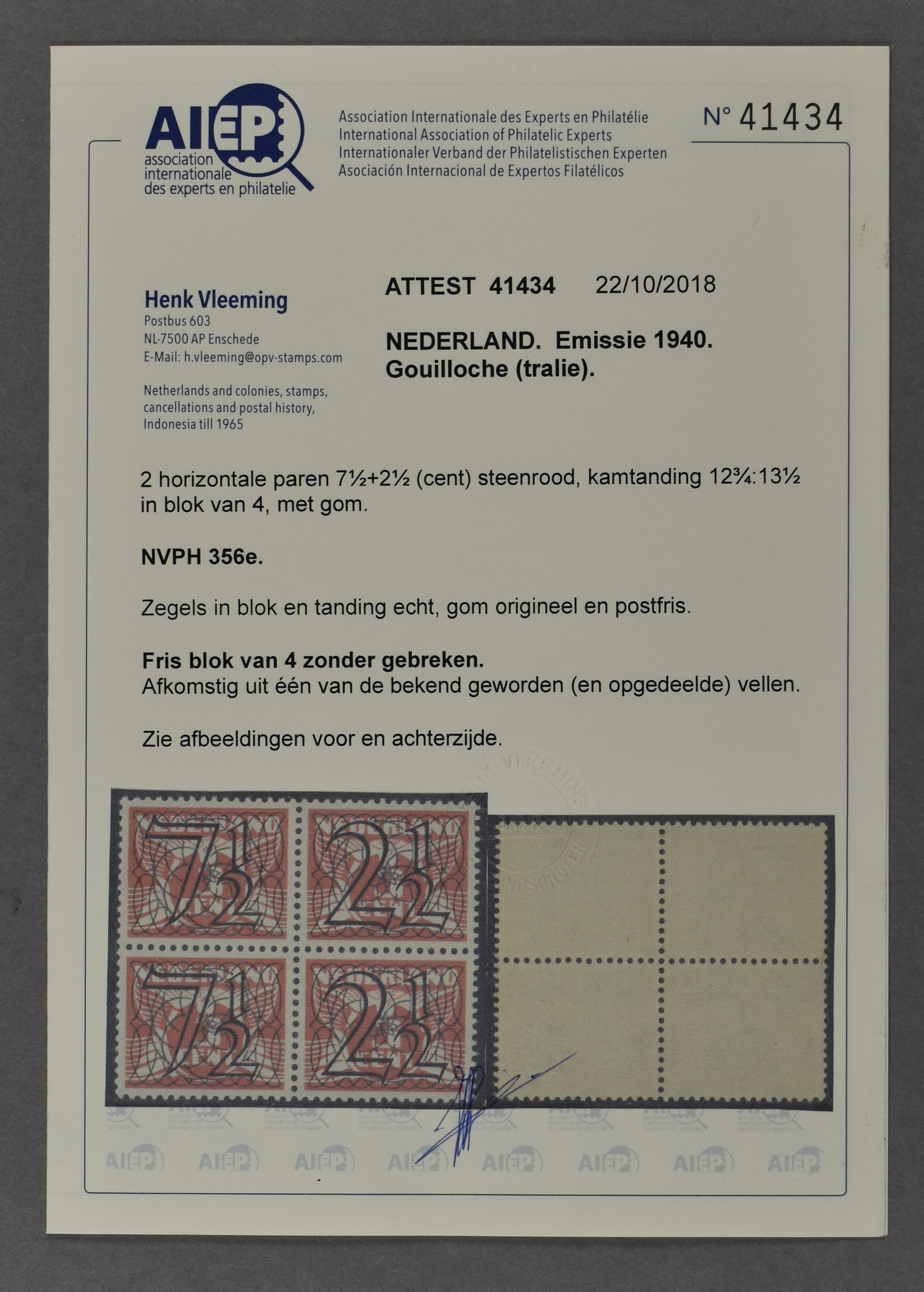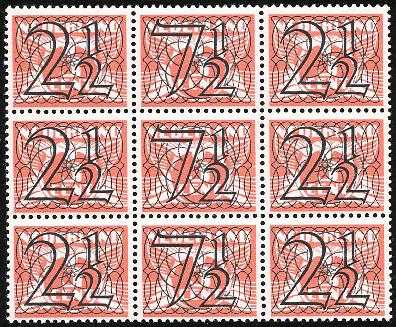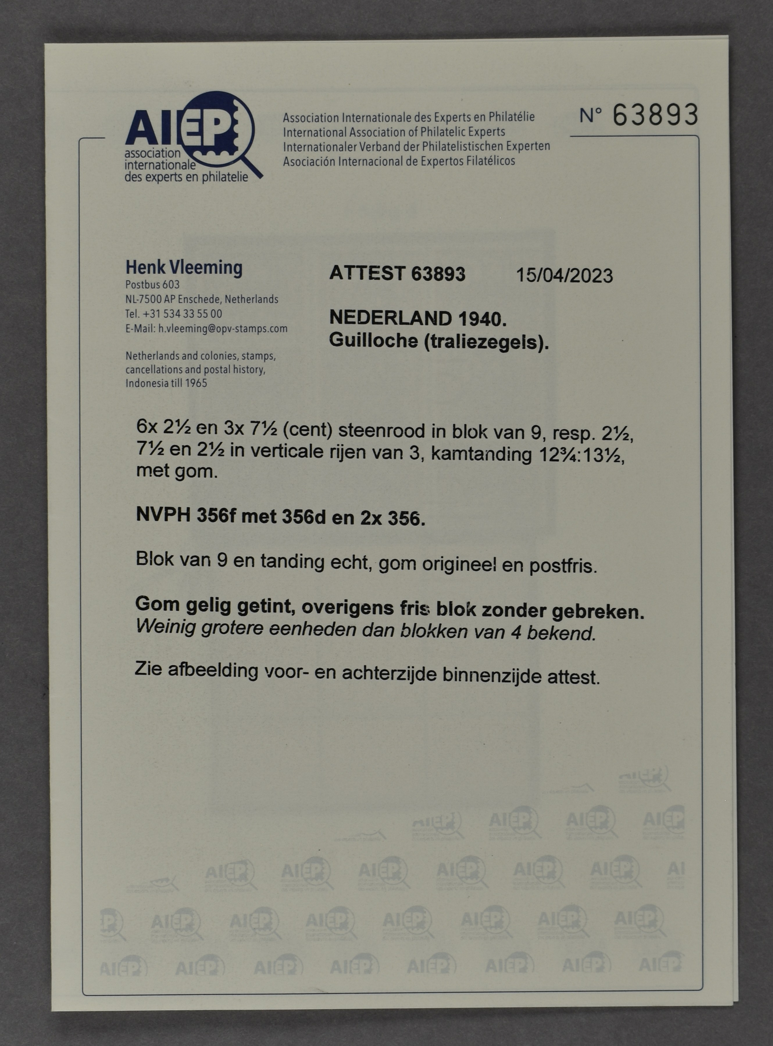 356f, 2½ en 7½ cent Guilloche in blok van 9 (356f met 356d en 2x 356), postfris prachtex. met certificaat Vleeming (2023): …"weinig grotere eenheden dan blokken van 4 bekend". € 2500+ (Image) (Image2)