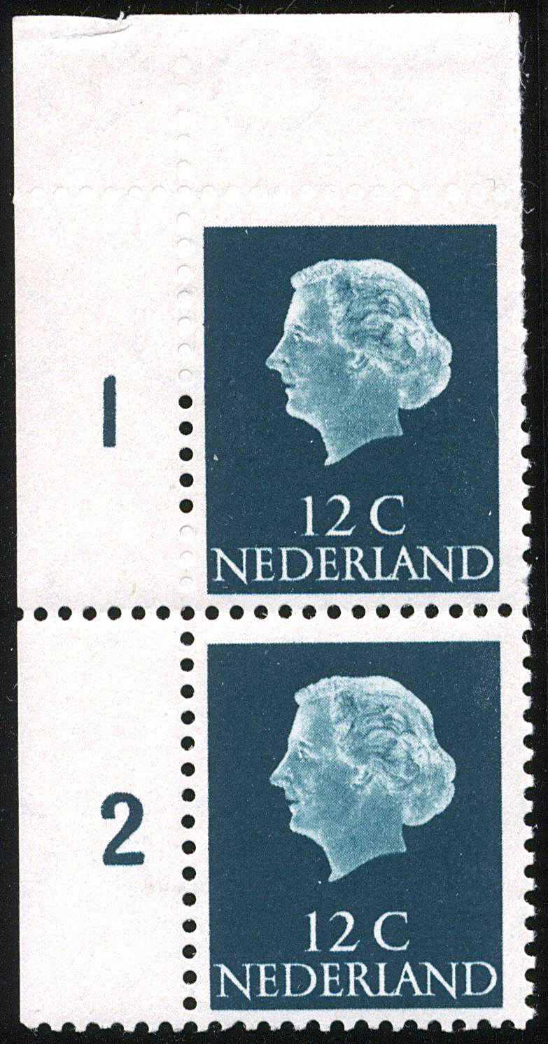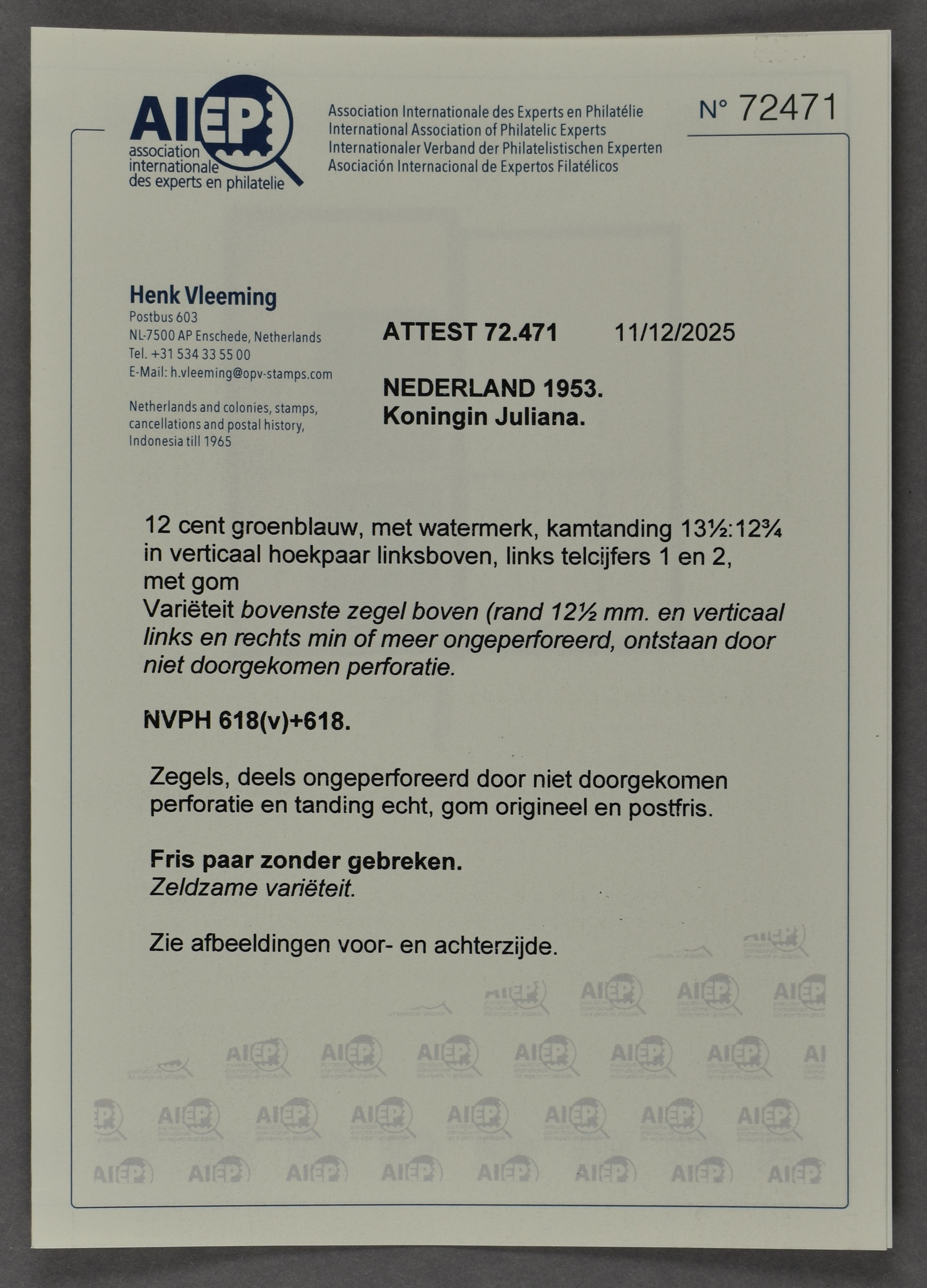 618v, 12 c groenblauw met variëteit: bovenzijde en aan linker- en rechterzijde min of meer ongeperforeerd, in postfris paar met nr. 618 en certificaat Vleeming (2025) € 2500 (Image) (Image2)