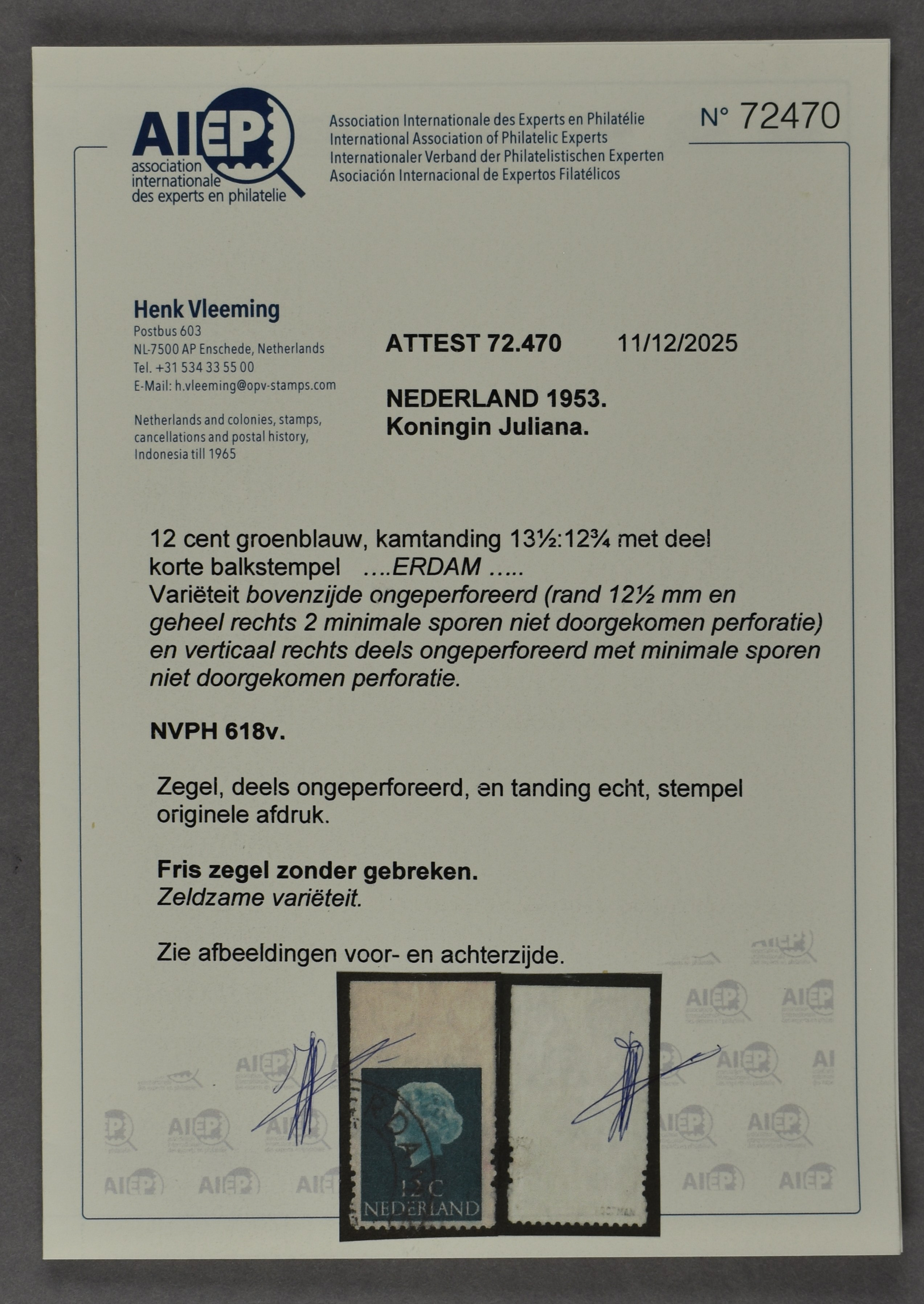 618v, 12c groenblauw met variëteit: bovenzijde ongeperforeerd, gebruikt prachtex., zeldzame variëteit met certificaat Vleeming (2025) € 2500 (Image)