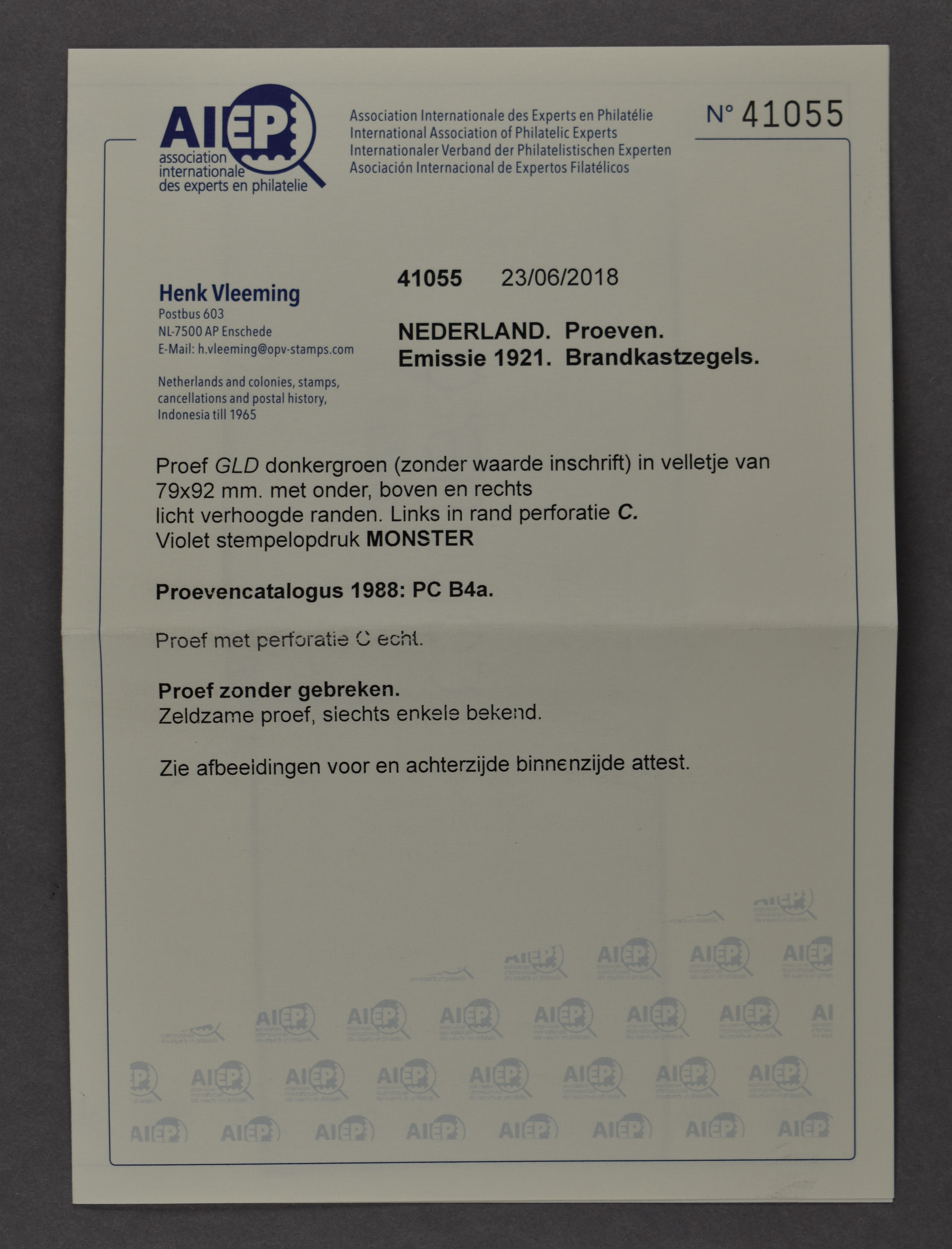 1416 (og) imagePC.B4a, proef zonder waarde-inschrift in donkergroen, in de kleur van de 15 cent ('blauw-groen'), in de tekening van de 1½ gulden, ongetand, gedrukt op ongegomd velletje met boven, rechts en onder licht verhoogde randen, links met geperforeerde C, met violette afstempeling MONSTER, op achterzijde rode afdruk klein stempeltje. Cat. PC (1988) ƒ 650. Cert. Vleeming (2018) met opmerking: 'Zeldzame proef, slechts enkele bekend' (Image)