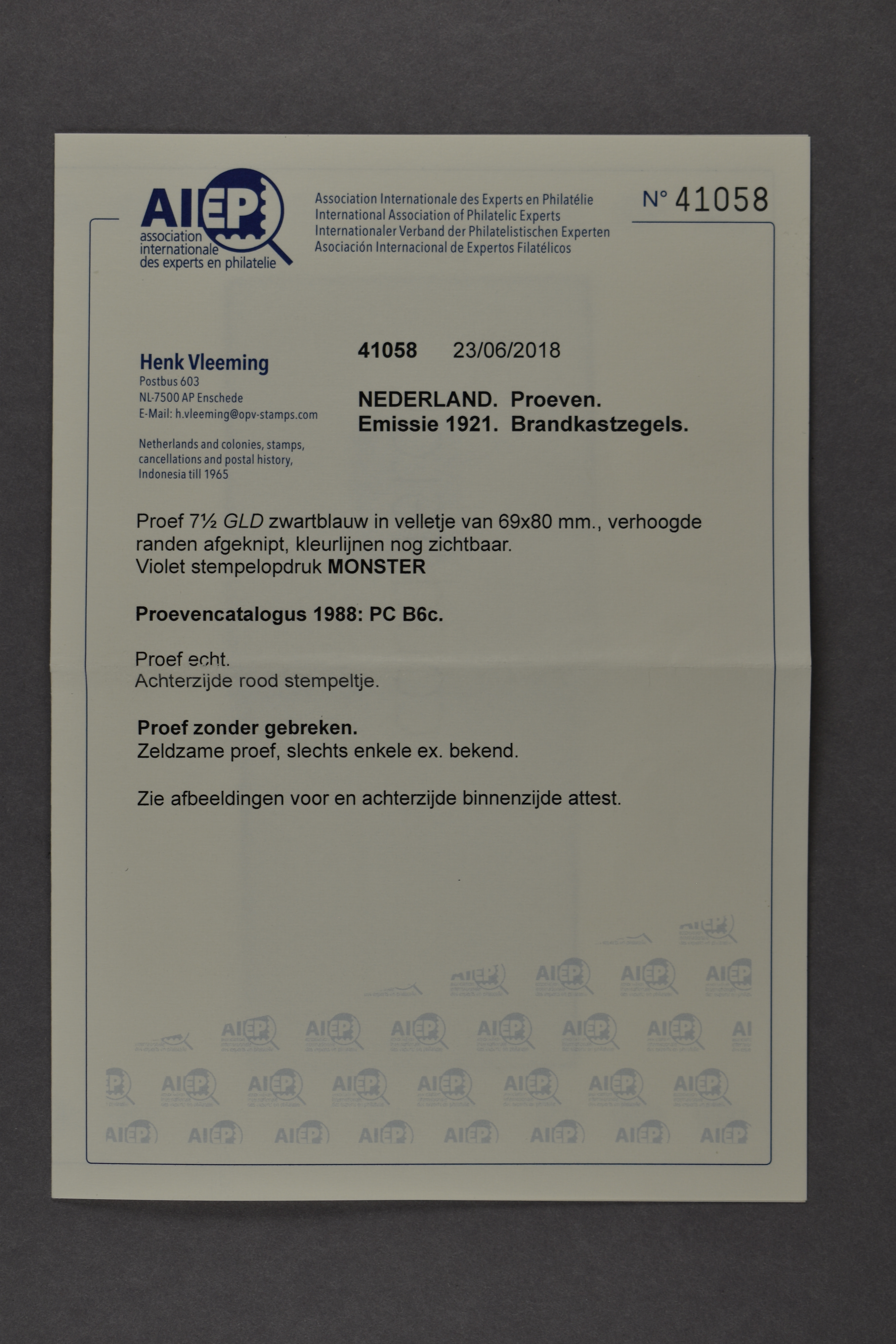 1417 (og) imagePC.B6c, proef met waarde-inschrift 7½ Gld in zwartblauw, ongetand, gedrukt op ongegomd velletje waarvan de licht verhoogde randen zijn afgeknipt (kleurlijnen zijn nog zichtbaar), op achterzijde rode afdruk klein stempeltje en met potlood geschreven V 5078. Cat. PC (1988) ƒ 650. Cert. Vleeming (2018) met opmerking: 'Zeldzame proef, slechts enkele ex. bekend' (Image)