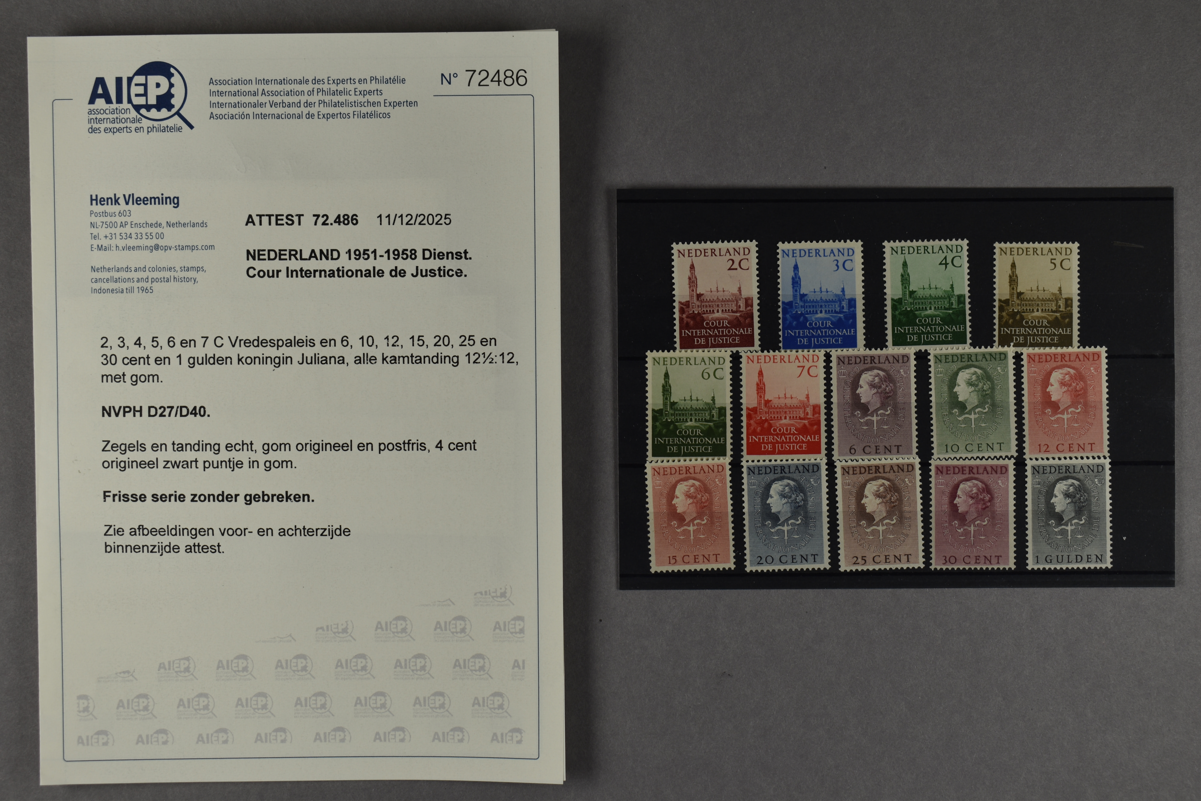1433 nh imageD27/D40, Cour Internationale de Justice, 2 cent t/m 1 gulden, complete prachtserie met certificaat Vleeming (2025) € 2725 (Image) (Image2) (All Images)
