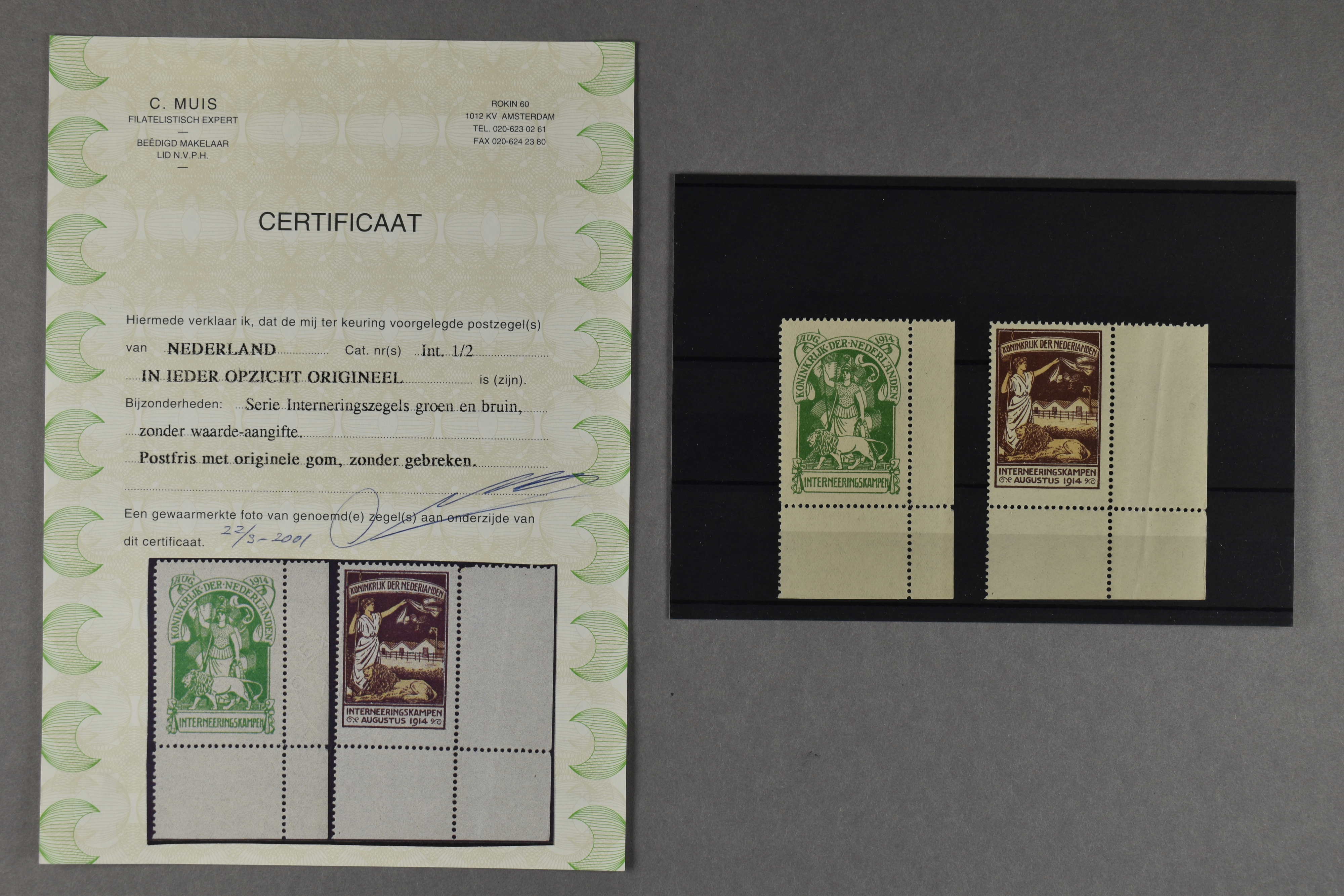 1434 nh imageIN1/IN2, Nederlandse Maagd in groen en bruin, postfrisse hoekrandstukken met certificaat Muis (2000) € 650 (Image) (Image2) (All Images)
