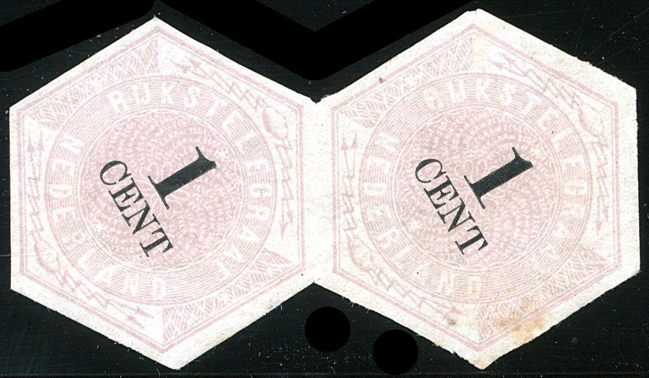 1436 og imageTG1v, 1 cent lila en zwart in verticaal paar met variëteit: geheel ongetand. Ongebruikt met originele gom, 1 zegel met roestpuntje, ov. prachtex. en zeer zeldzaam! Certificaat NVPH (1981) € 5000 (Image) (Image2) (All Images)