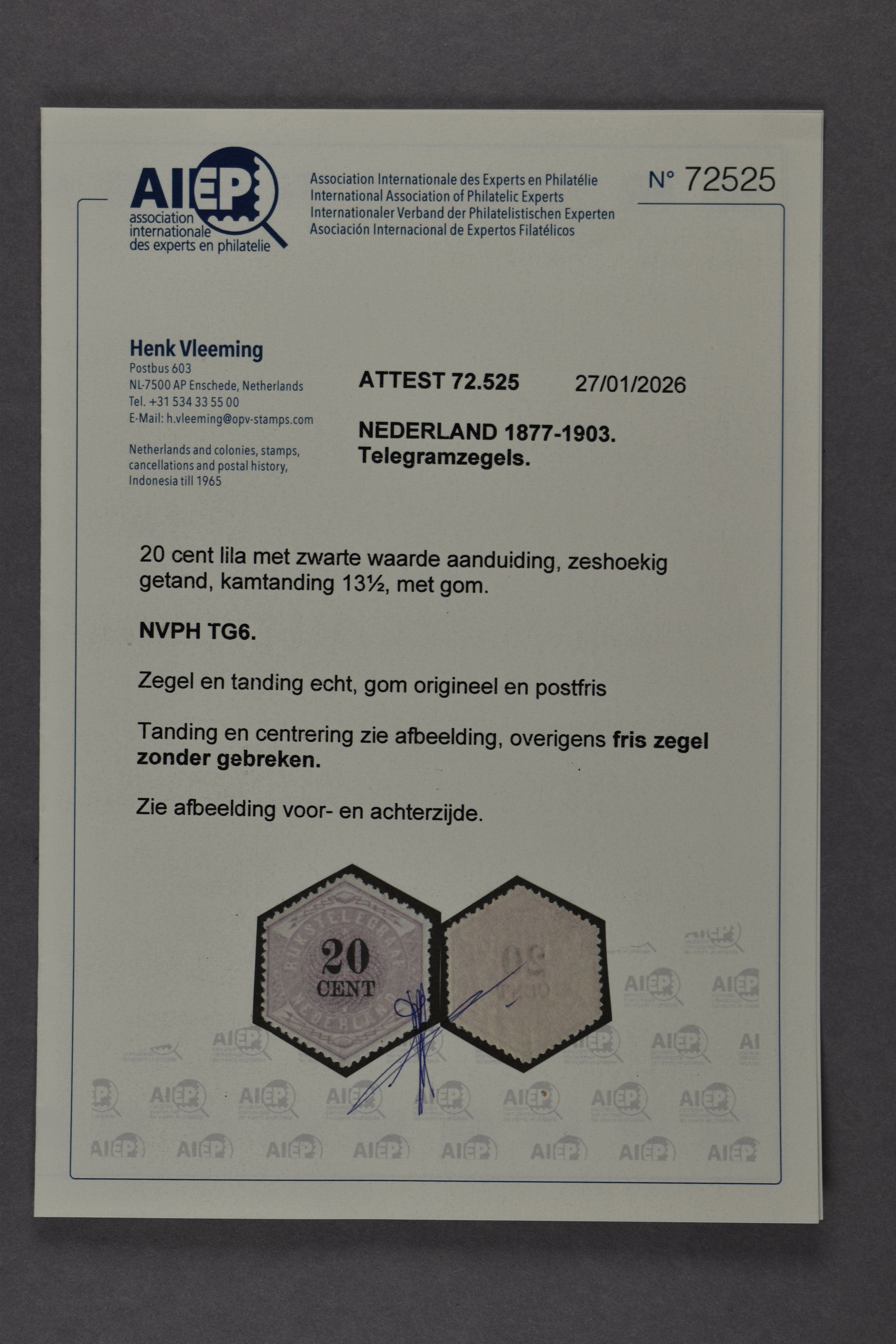 1438 nh imageTG6, 20 cent lila en zwart, postfris prachtex. met certificaat Vleeming (2026) € 2300 (Image) (Image2) (All Images)