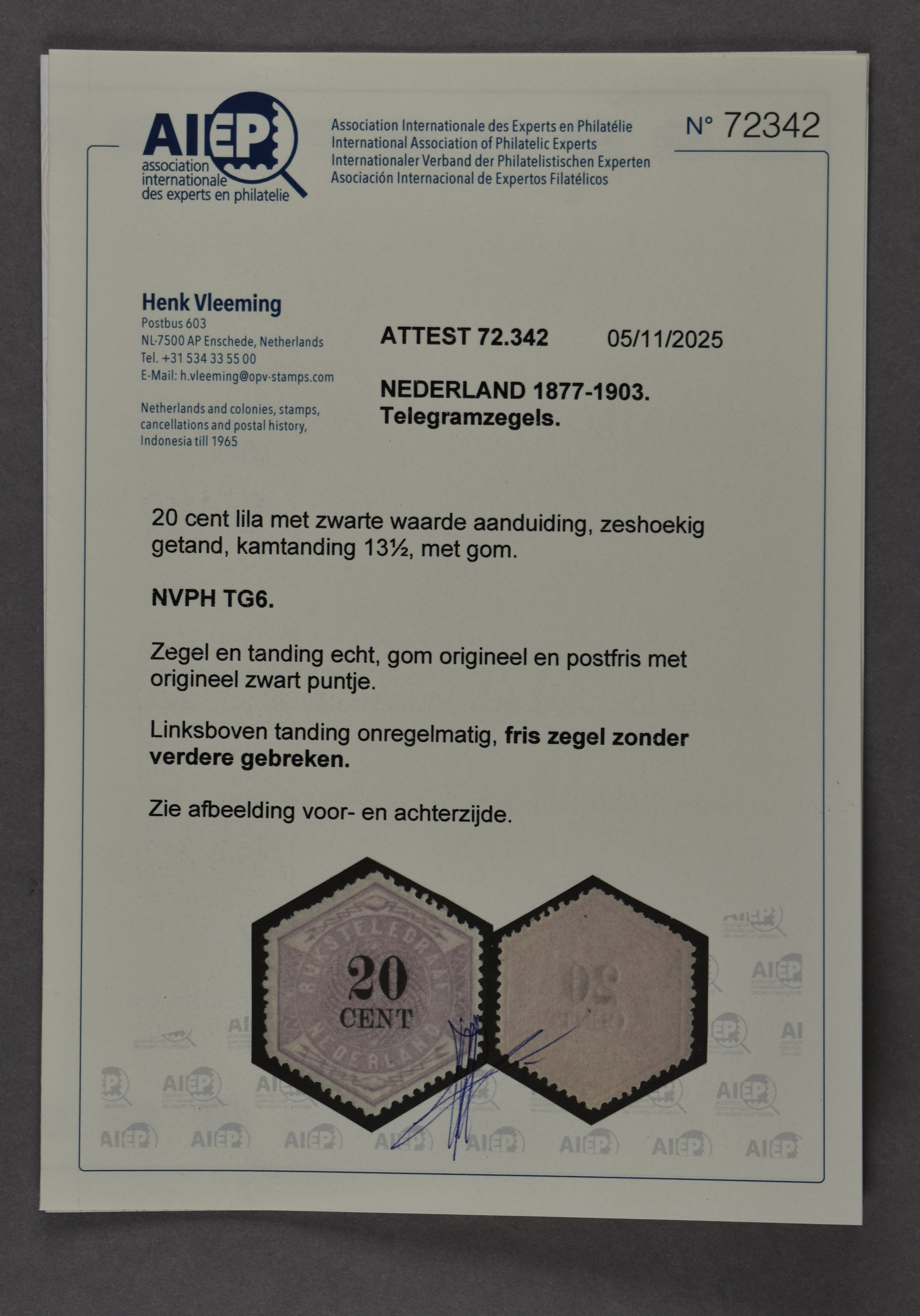1439 nh imageTG6, 20 cent lila en zwart, onregelmatig getand , postfris prachtex. met certificaat Vleeming (2025) € 2300 (Image) (Image2) (All Images)