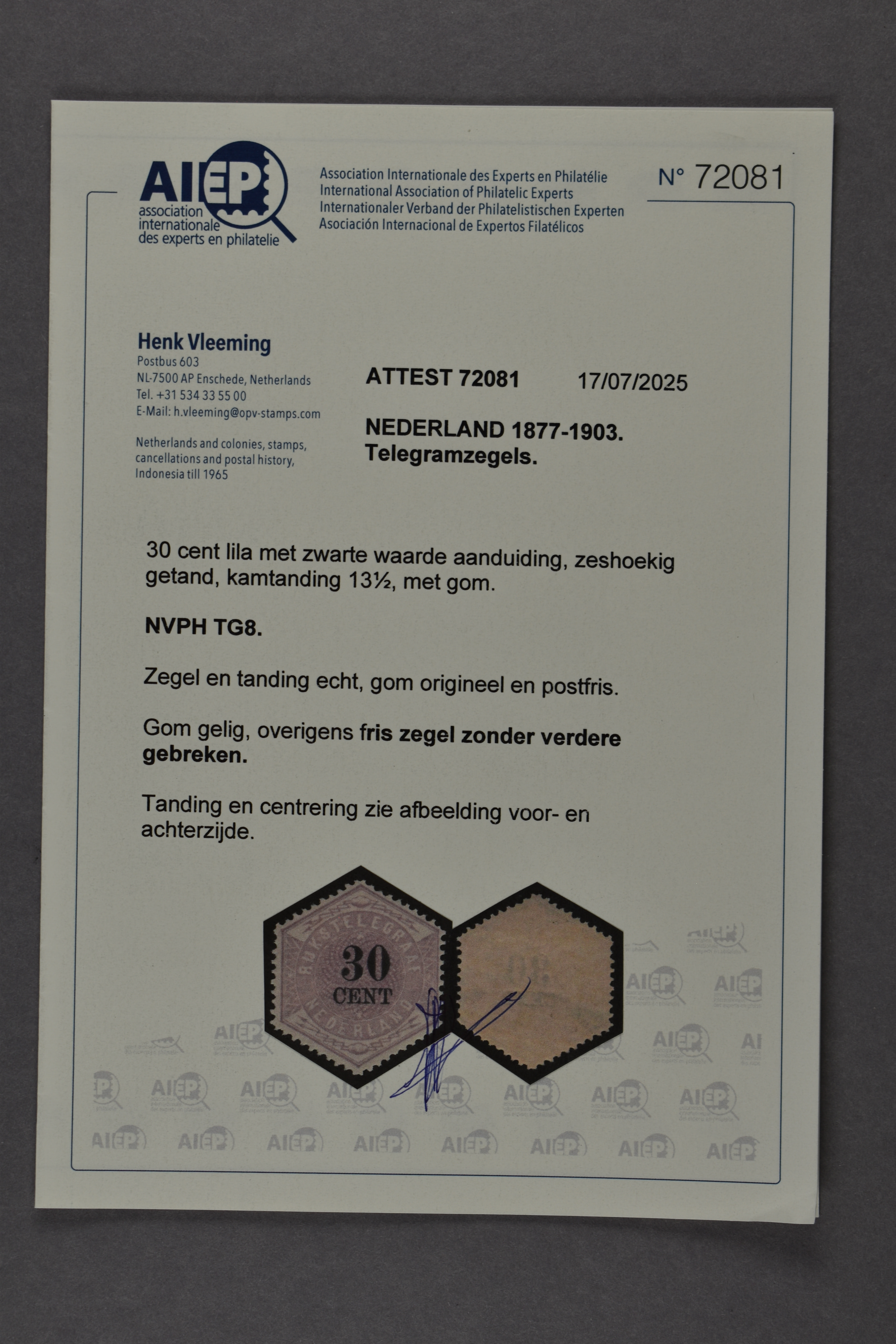 1440 nh imageTG8, 30 cent lila en zwart, postfris prachtex. met certificaat Vleeming (2025) € 2300 (Image) (Image2) (All Images)