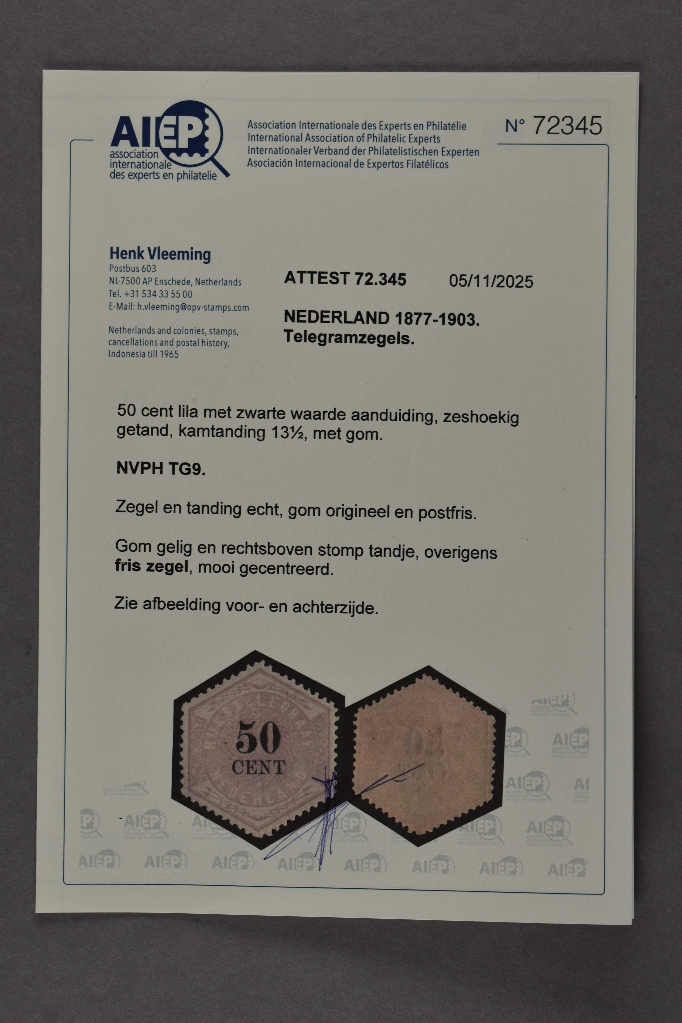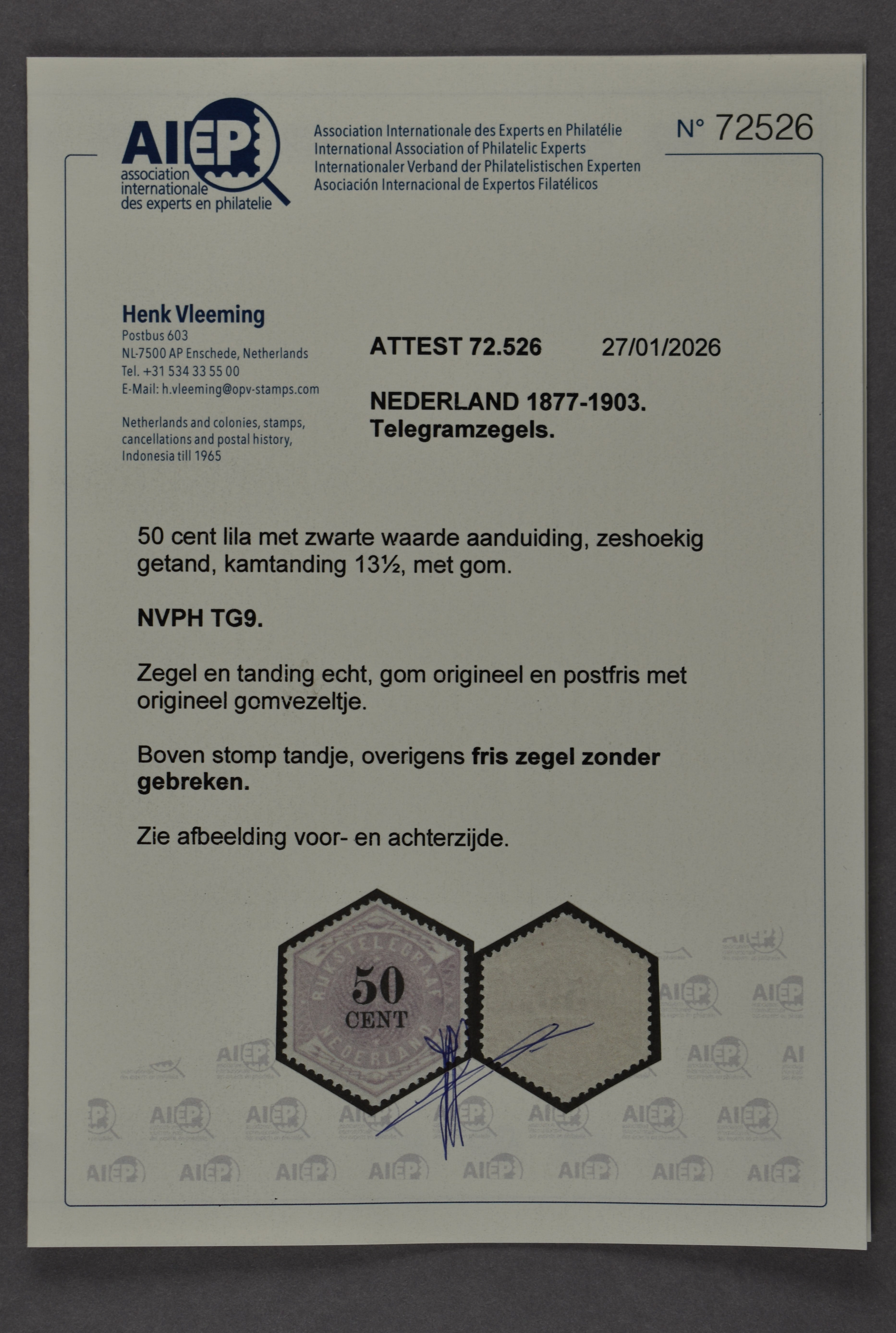 1441 nh imageTG9, 50 cent lila en zwart, postfris prachtex. met certificaat Vleeming (2026) € 2700 (Image) (Image2) (All Images)