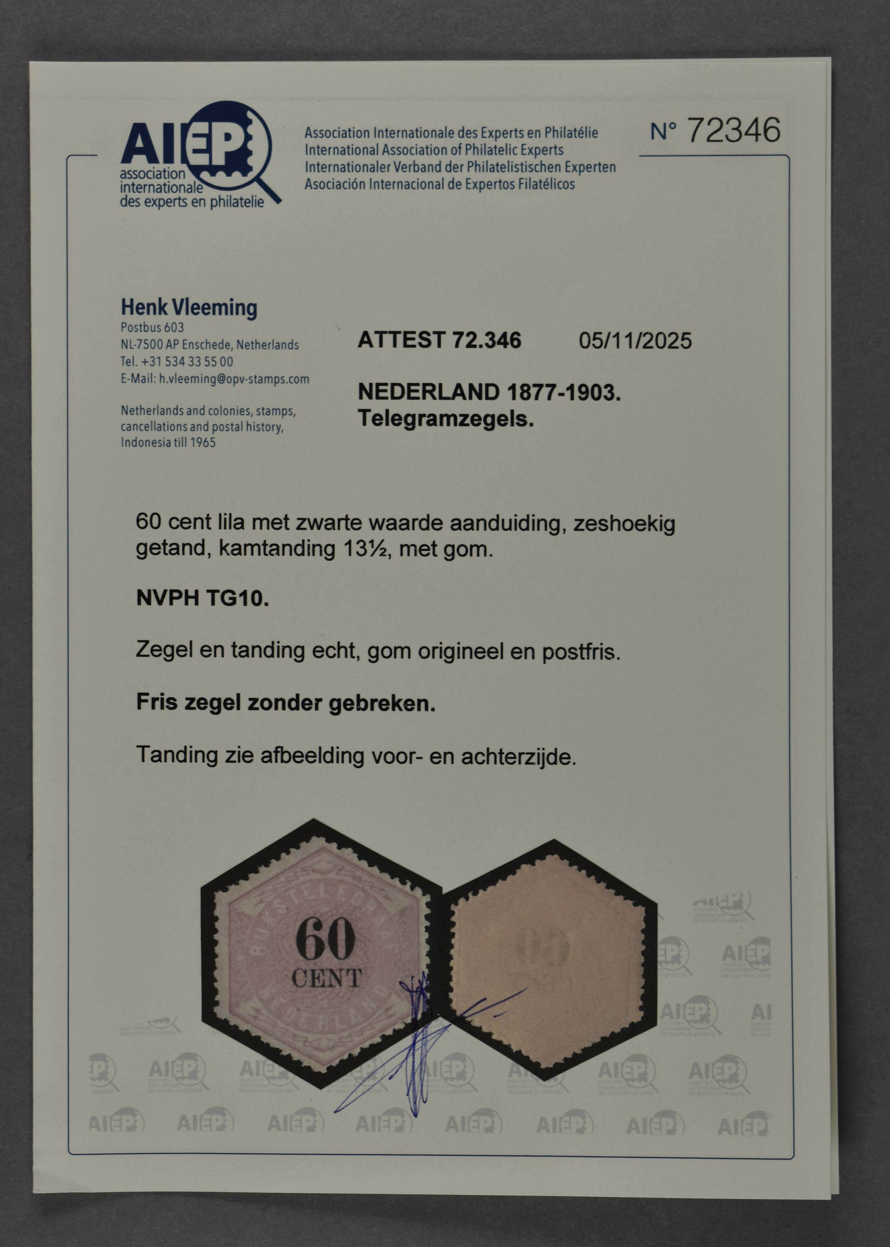 1443 nh imageTG10, 60 cent lila en zwart, postfris prachtex. met certificaat Vleeming (2025) € 5000 (Image) (Image2) (All Images)