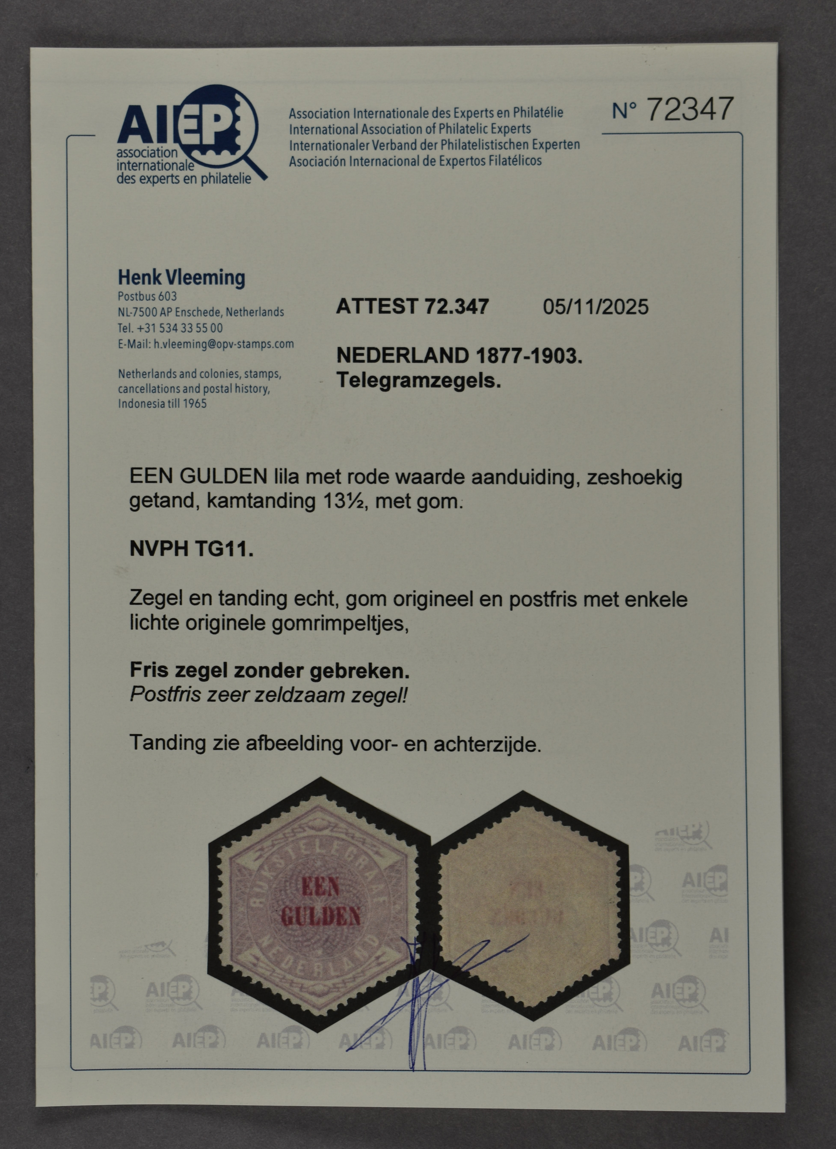 1444 nh imageTG11, Een gulden lila en rood, postfris prachtex. met enkele originele gomrimpeltjes en certificaat Vleeming (2025) € 9500 (Image) (Image2) (All Images)
