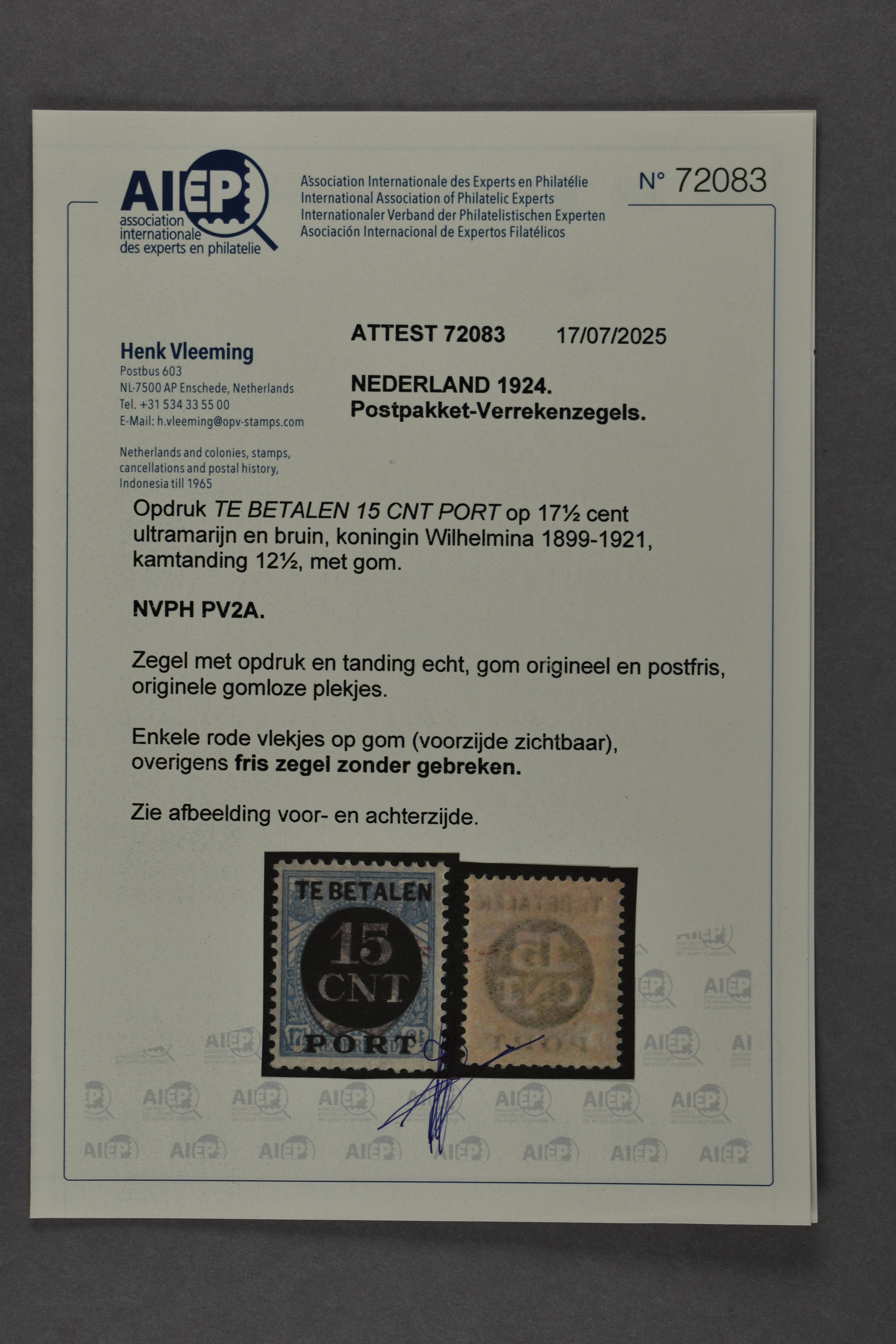 1445 nh imagePV2A, 15 CNT op 17½ cent ultramarijn en bruin, postfris prachtex. met minimaal licht rood vlekje en certificaat Vleeming (2025) € 20.000 (Image) (Image2) (All Images)