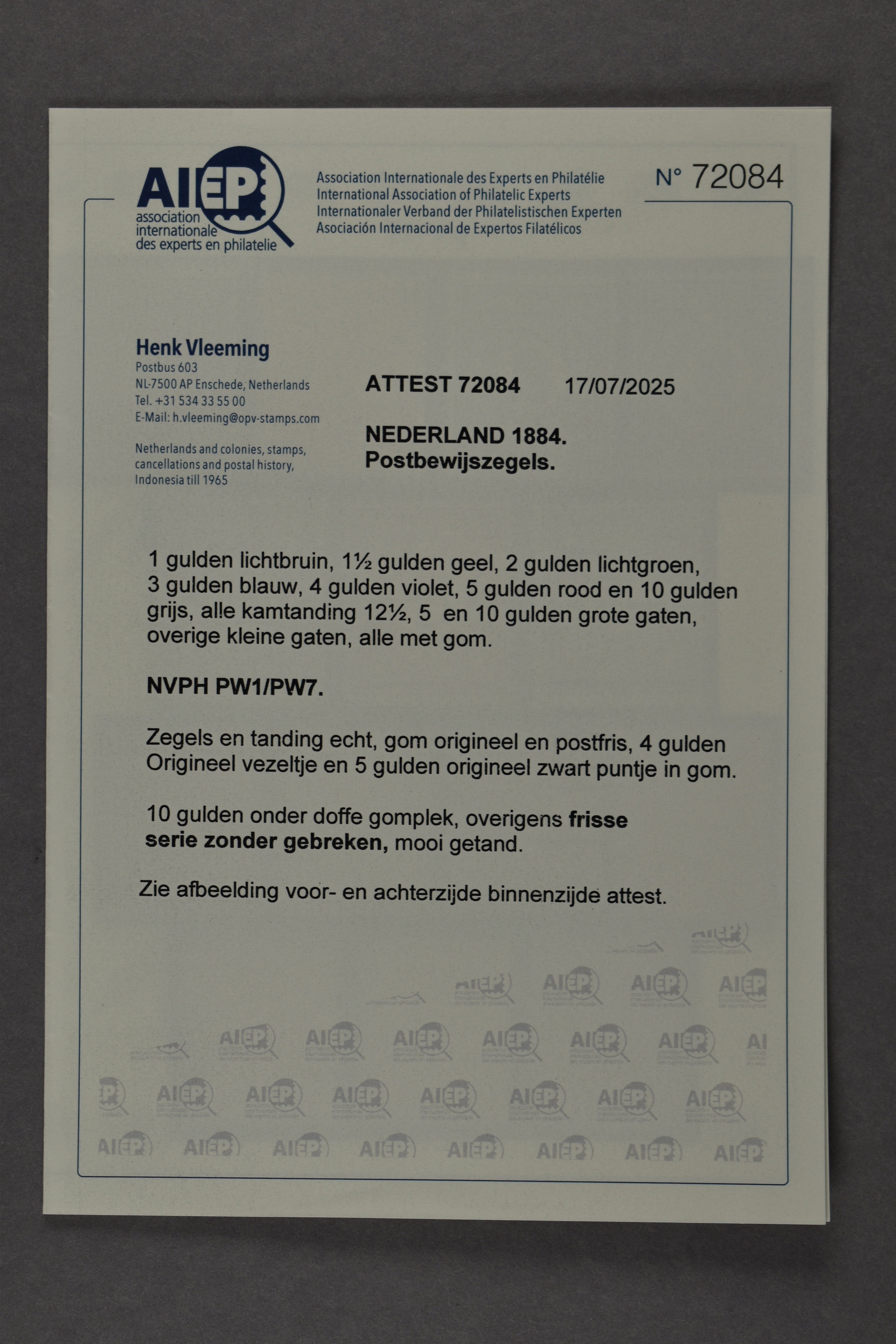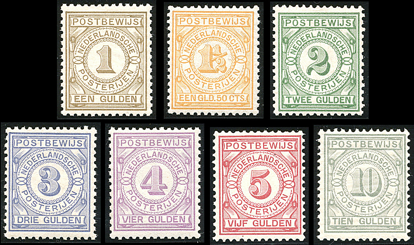 1446 nh imagePW1/PW7, 1 t/m 10 gulden, complete postfrisse prachtserie met certificaat Vleeming (2025): "... 10 gulden doffe gomplek, ov. frisse serie, mooi getand". € 10.000 (Image) (Image2) (All Images)