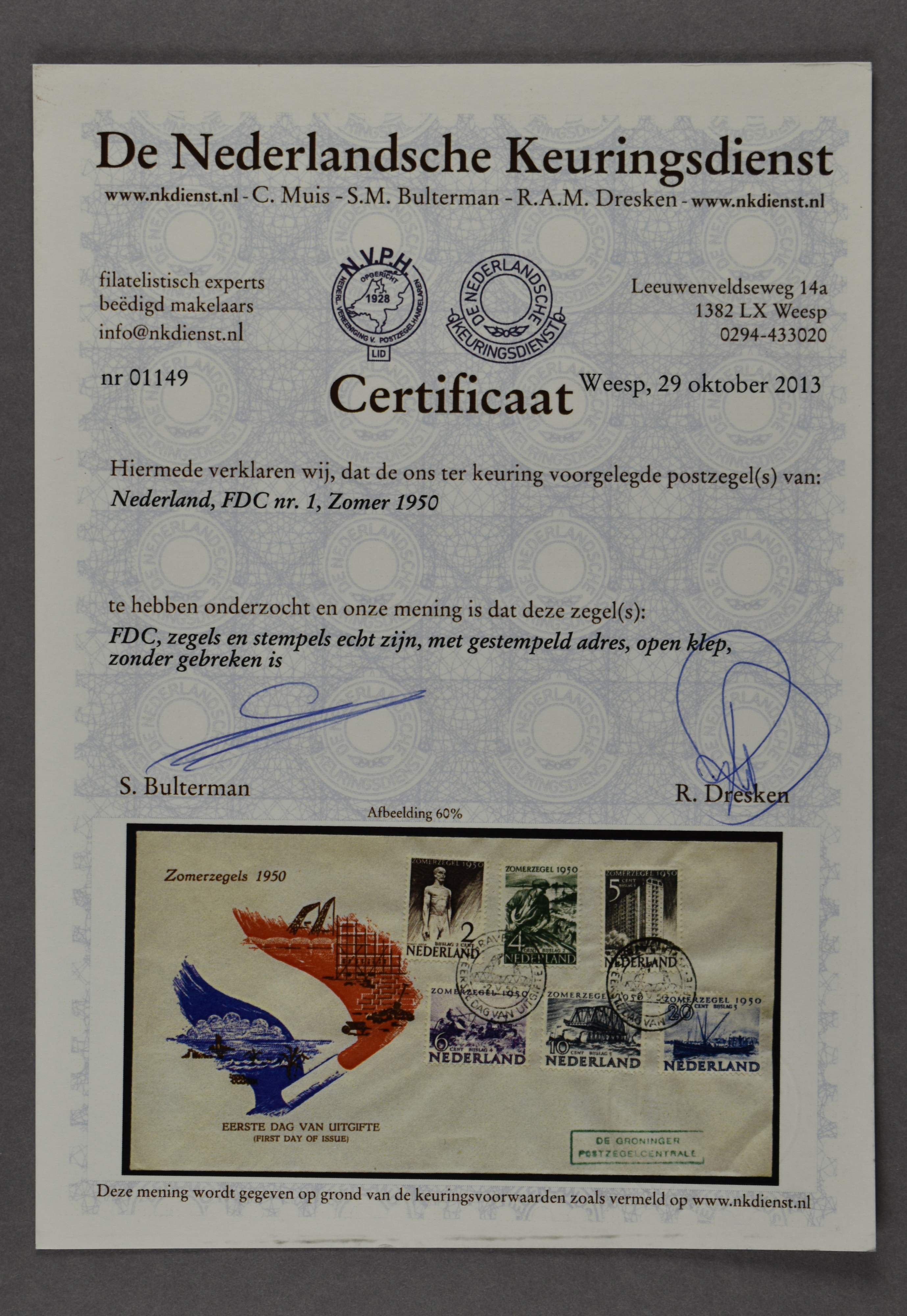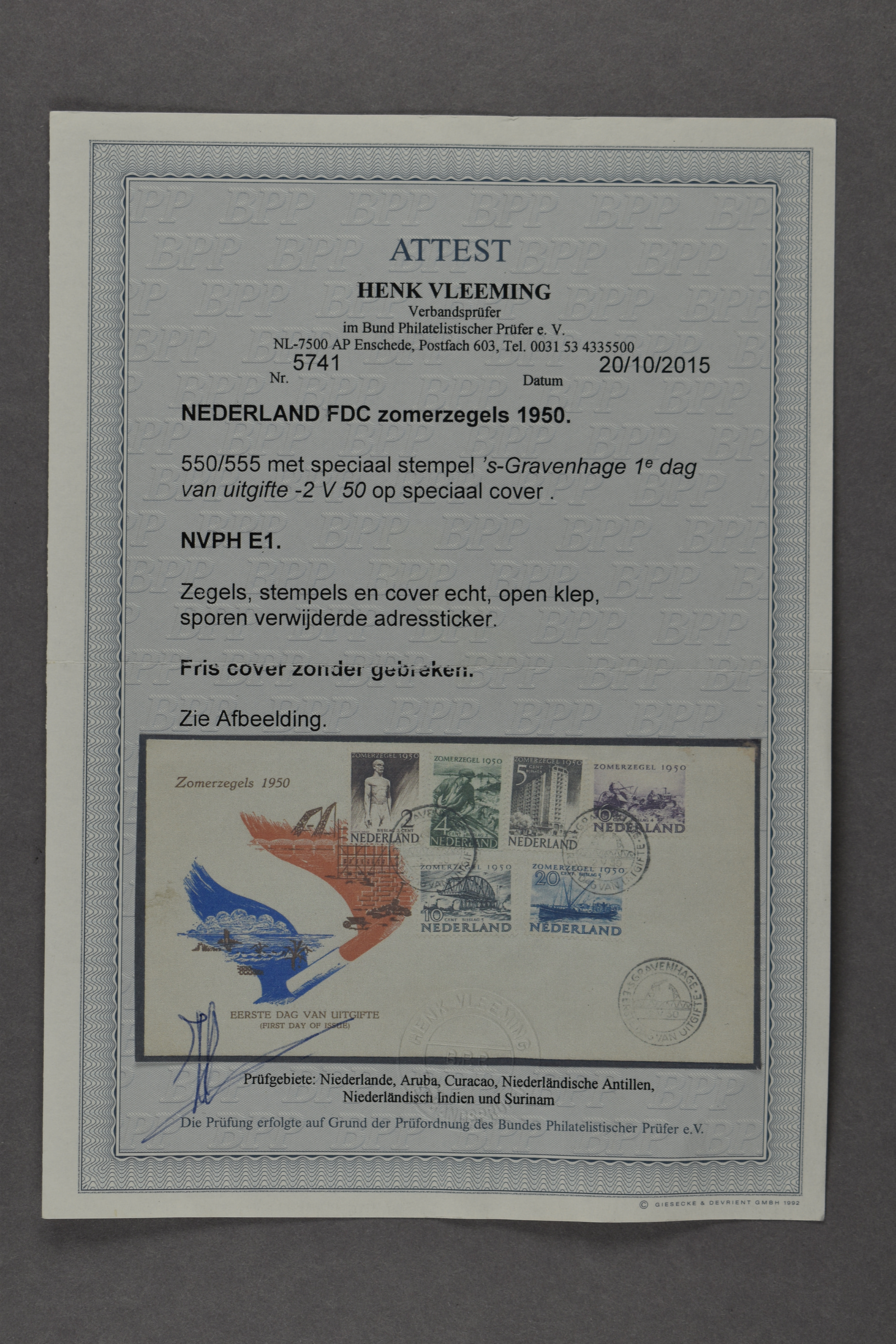 1447 on cover imageE1, Zomerzegels 1950 met certificaat NKD (2013): "... zegels en stempels echt, gestempeld adres, open klep, zonder gebreken" € 1600 (Image)