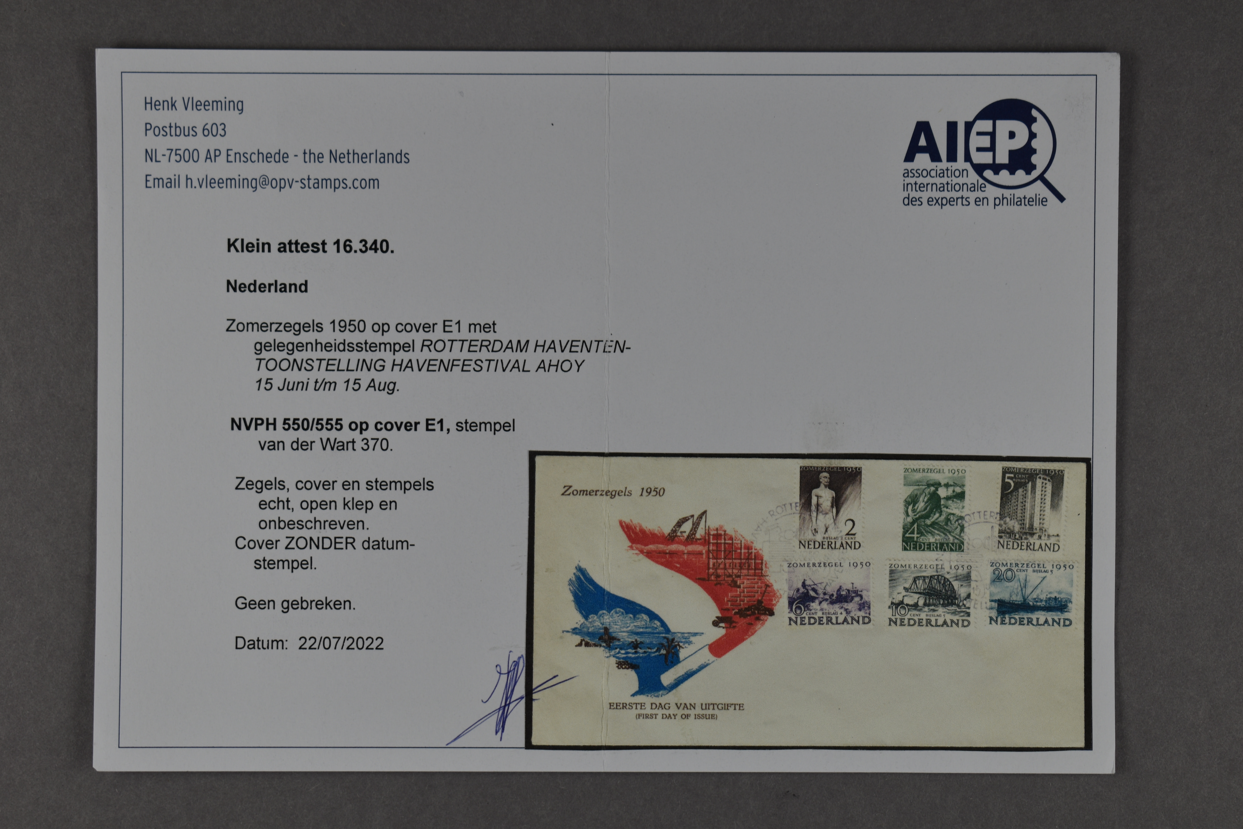 1449 on cover imageE1, Zomerzegels 1950 met gelegenheidsstempel "Rotterdam Havententoonstelling Havenfestival Ahoy 15 Juni t/m 15 Aug". (vd Wart stempel 370), onbeschreven prachtcover met attest Vleeming (2022) Tax. € 200 (Image)