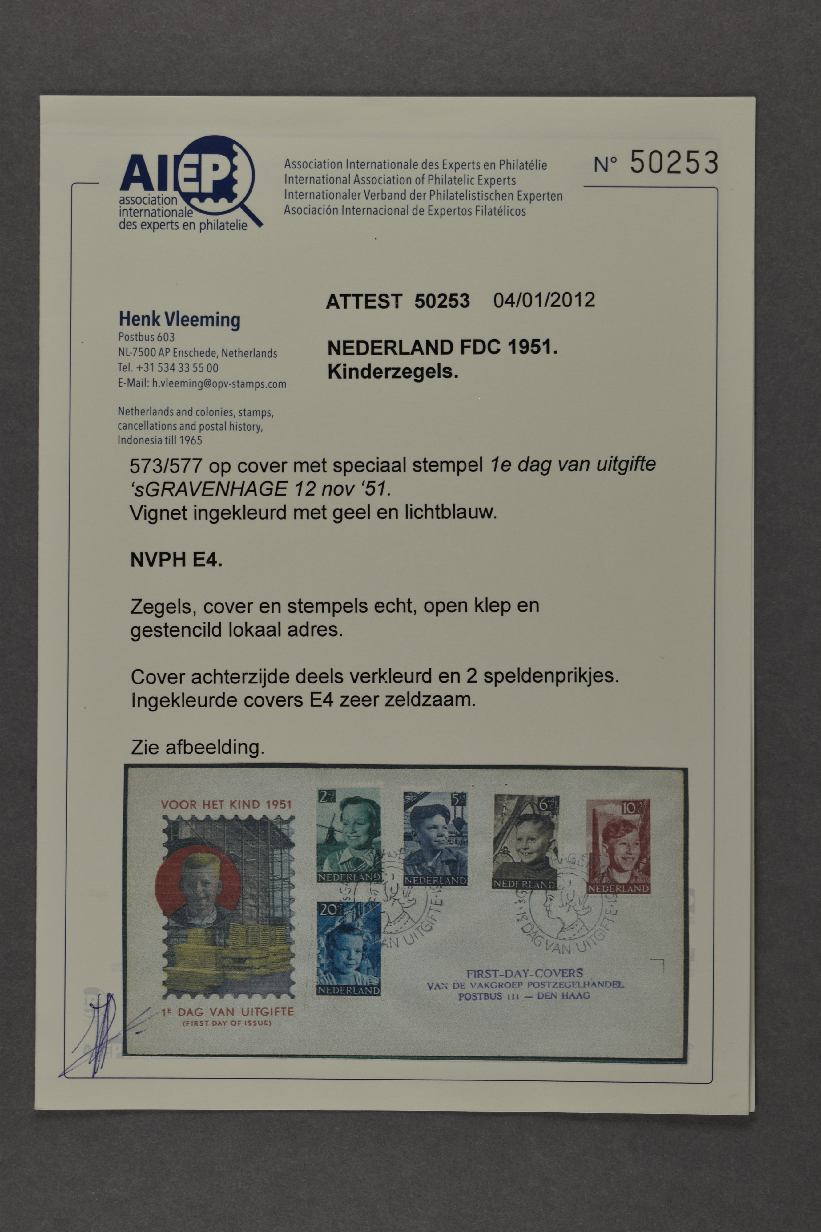 1450 on cover imageE4, Kind 1951 met geel en lichtblauw ingekleurd vignet. Zeldzame zeer fraaie cover met certificaat Vleeming (2012) Tax. € 100 (Image)