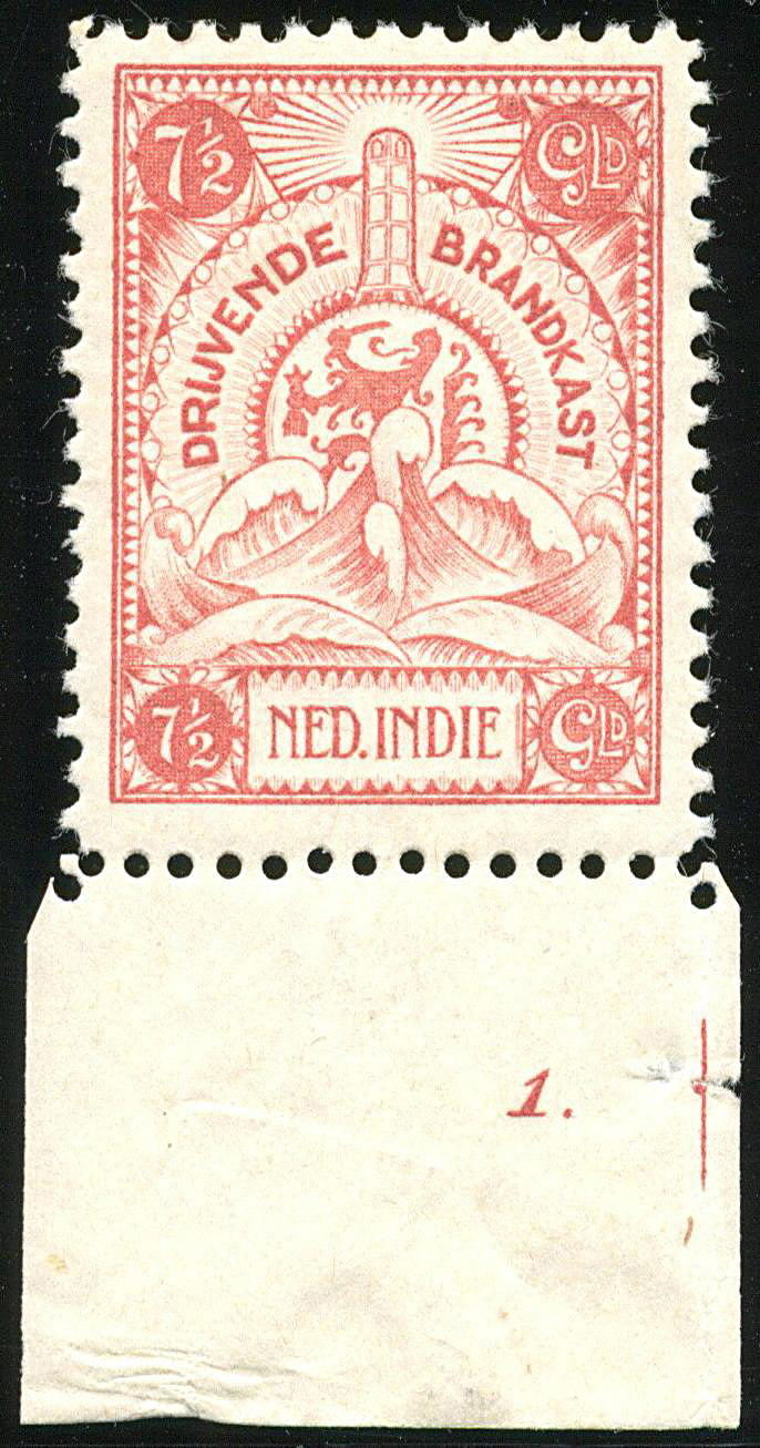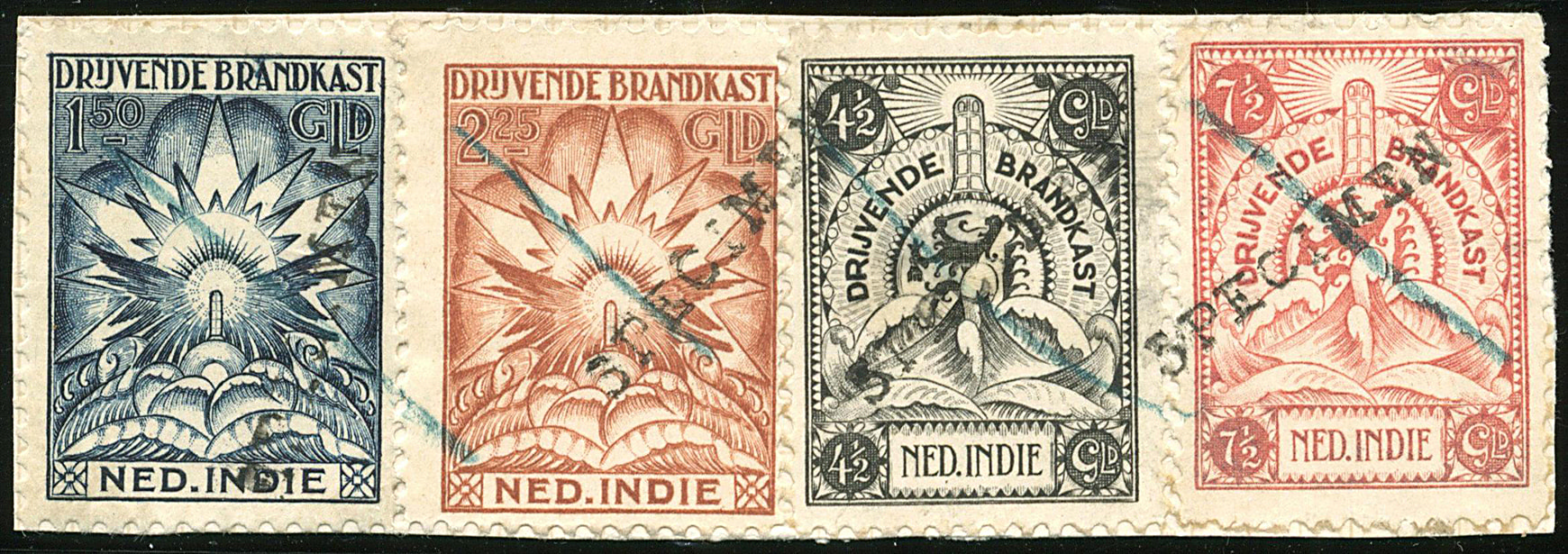 1482 og BK1, 4/5 tezamen met nrs. 147 en 148 in paar (alle zegels prachtexemplaren) op een gedeelte van de voorzijde van een poststuk van 520 gram, verzonden van Goeroepahi 26-6-1923 aangetekend en per scheepsbrandkast naar Den Haag, waar het stuk kon worden afgehaald aan de Prins Mauritslaan. De afzender is de Exploratie en Exploitatie Maatschappij 'Bolang Mongondou' en de geadresseerde de directie van deze maatschappij, gevestigd aan de Koningin Emmakade 156 te Den Haag. Te Goeroepahi, in Noord-Celebes, werd stofgoud gedolven. Ten behoeve van deze mijnbouwmaatschappij is er een hulppostkantoor gevestigd van 1-8-1917 tot 19-3-1926. Toen werd het goud delven daar niet meer rendabel. Hoogst waarschijnlijk is met het poststuk stofgoud verpakt geweest dat moest worden beoordeeld o.i.d. door de directie in Den Haag. Tarief: briefport 200 cent + R-recht 20 cent = 220 cent, brandkastrecht 26 x 15 cent = 390 cent, voldaan met brandkastzegels van 15 + 150 + 225 cent. Zie: Fil. Inf. (27), p.7520-135, afb. 88 met als opmerking 'Het is het enig bekende stuk met hoge waarden brandkastzegels waar geen filatelistische bijbedoelingen hebben voorgezeten.' Tentoonstellingsstuk en een van de absolute topstukken uit de Nederlands-Indische filatelie!