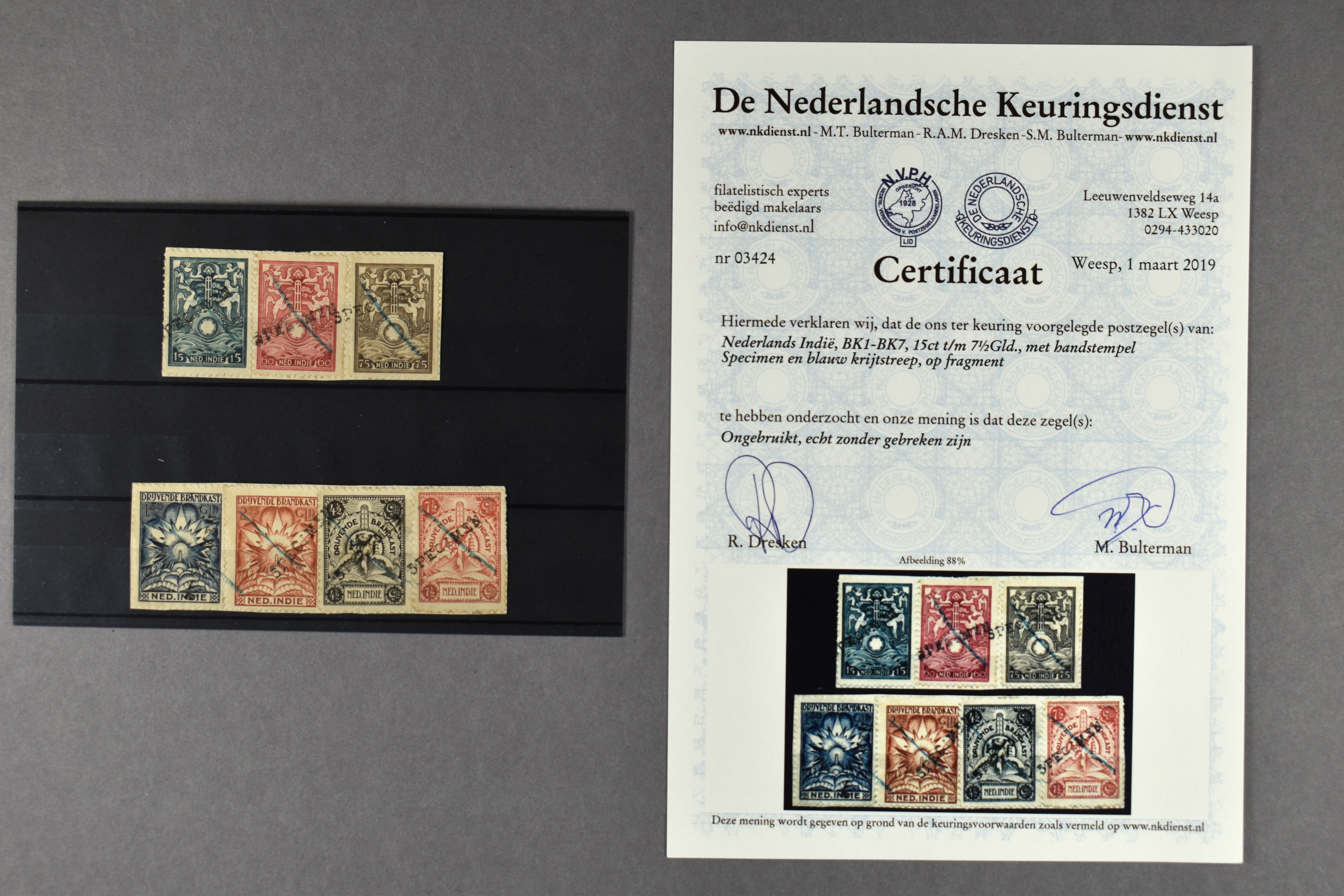 1480 (og) imageBK1/7, Brandkastserie op 2 knipsels, alle waarden met handstempelopdruk SPECIMEN en blauwe potloodstreep. Zie: Fil. Inf. (22), juni 1989, p.7520-49, afb. 47: 'Deze opdruk is zeer waarschijnlijk aangebracht door het General Post Office (G.P.O.) in Londen waarna de zegels naar één der Engelse Koloniën werden opgezonden. Het G.P.O. had deze zegels van de U.P.U. ontvangen in het kader van het uitwisselingsverkeer van de Wereldpostvereniging.' Hoogst zeldzame serie. Cert. NKD (2019) (Image) (Image2) (All Images)