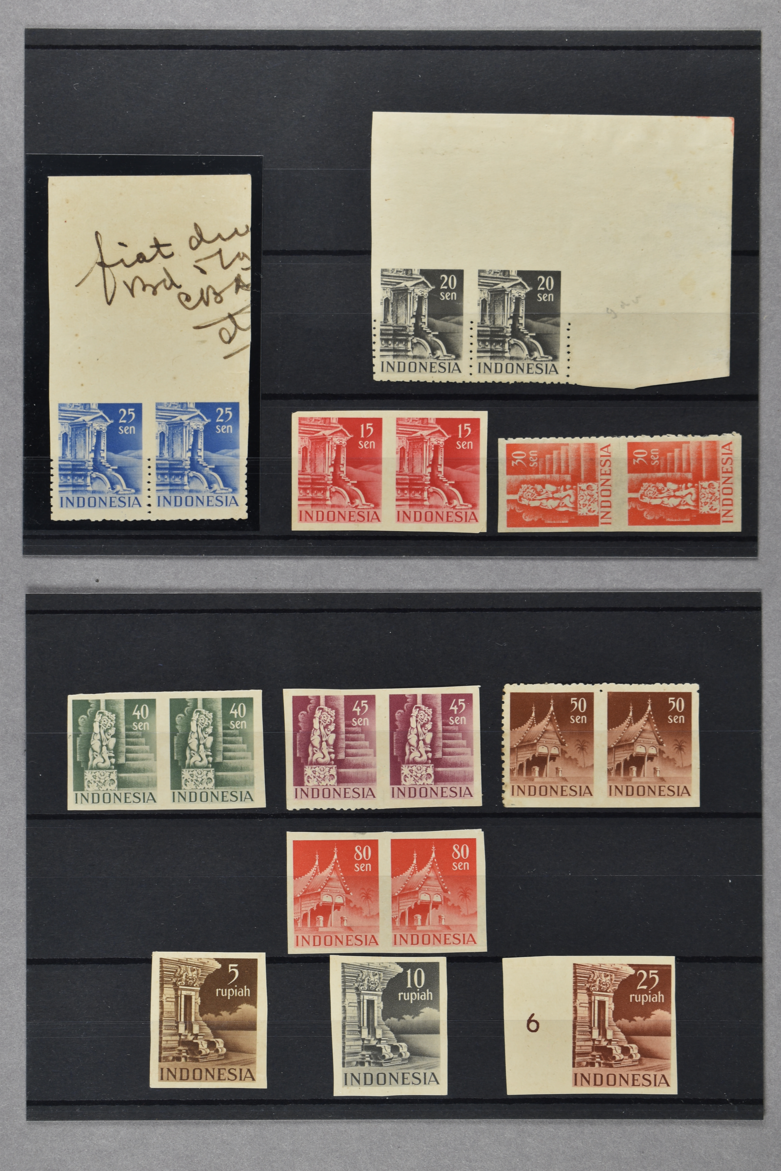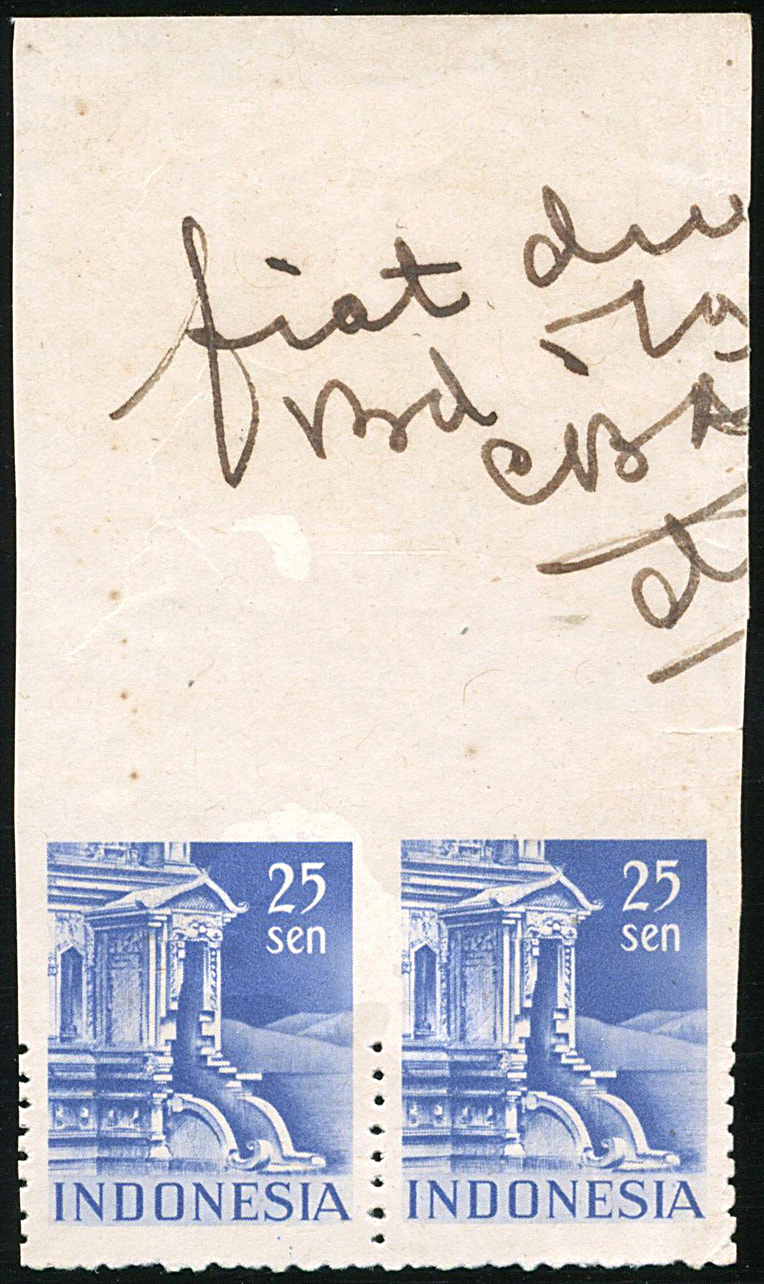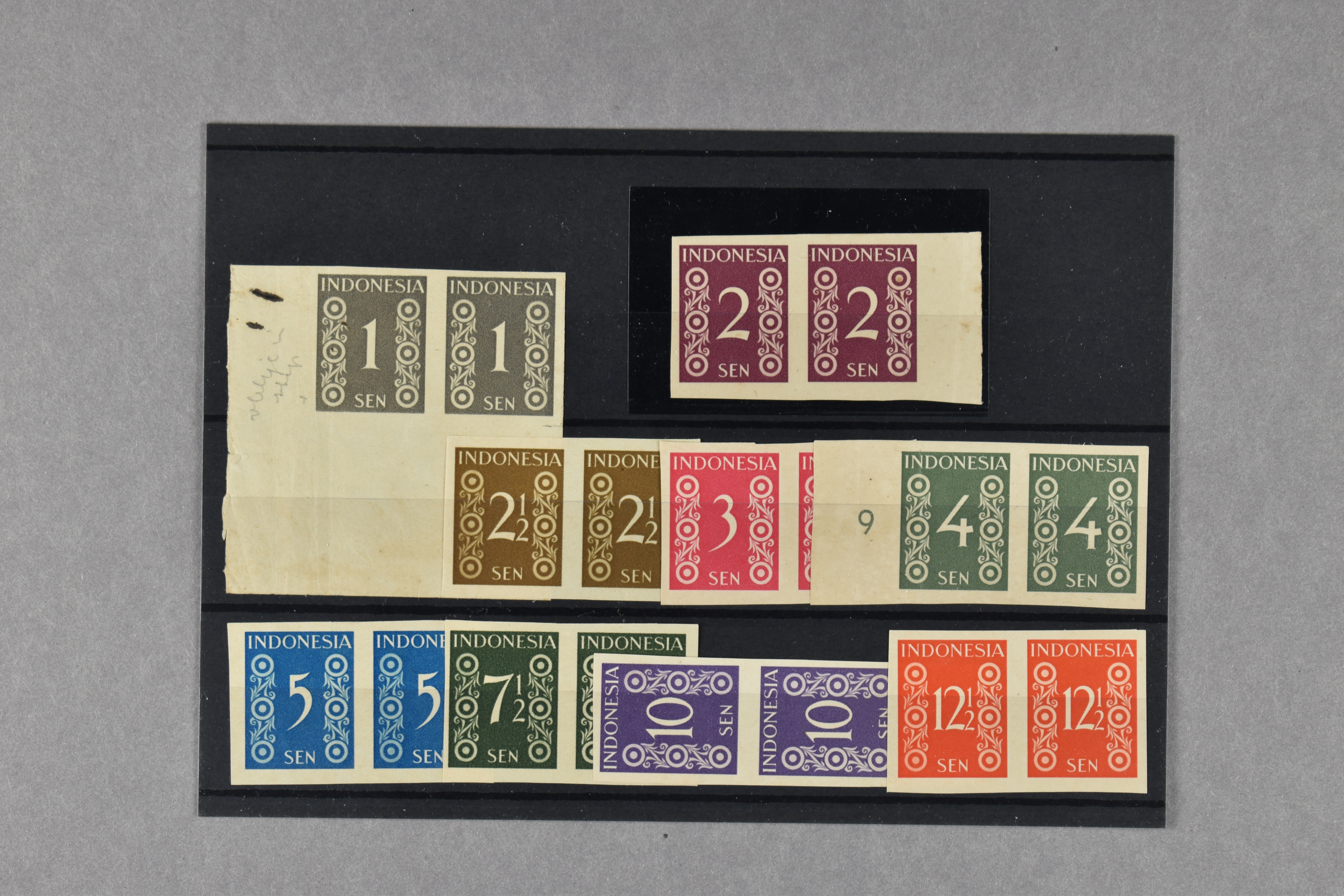 1490 (og) imageTemples and Buildings, 1949. From the series KPI.22/36, imperforated, ungummed. 15 Sen in pair, 20 and 25 sen both in pair with bottom half perforated, 30 sen in vertical pair with right side perforated, 40 and 80 sen in pair, 45 and 50 sen partly perforated, 5, 10 and 25 rupiah single. Interesting set with some rare partly perforated values (Image) (Image2) (All Images)