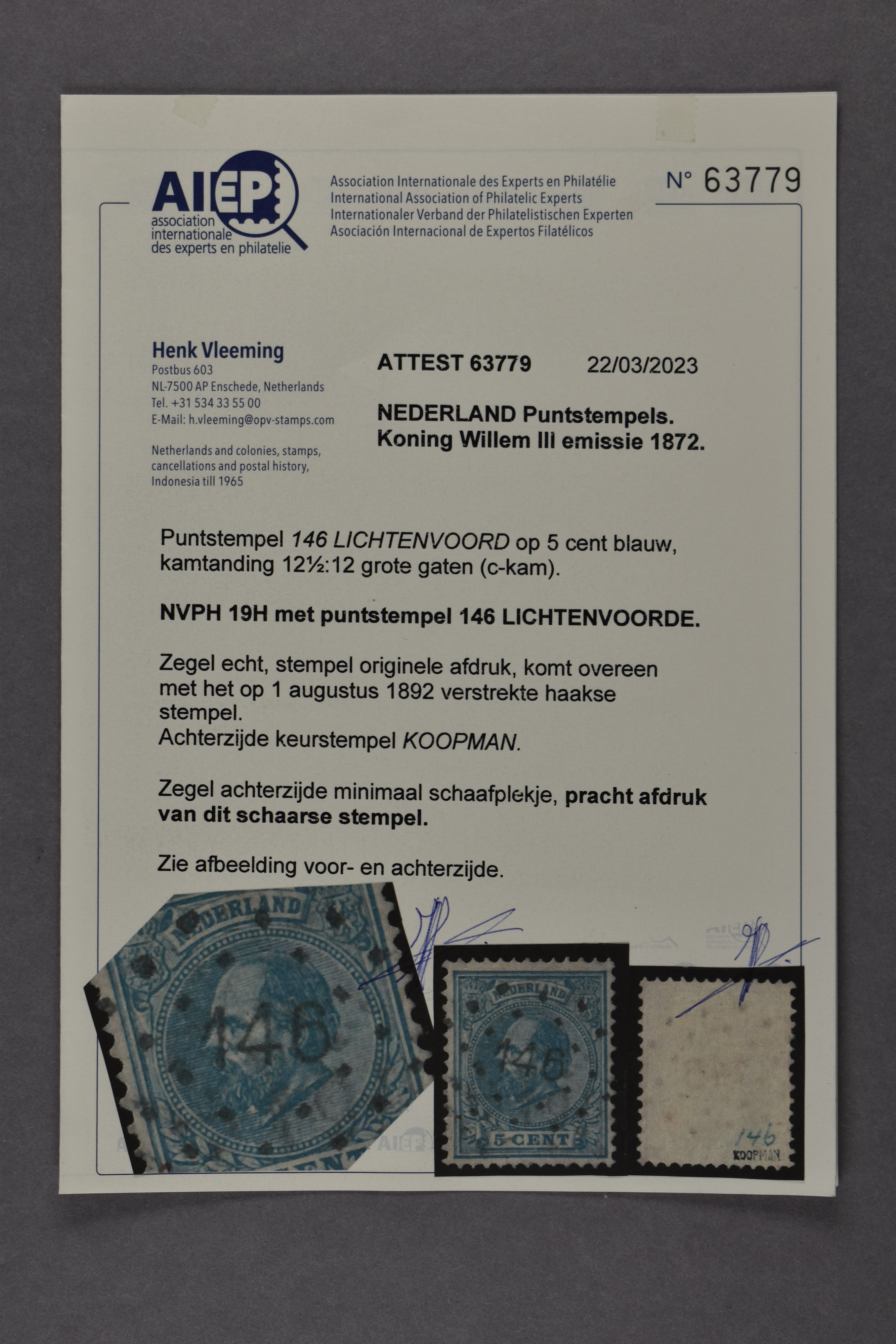 1561 o image146 = Lichtenvoorde op 5 cent blauw nr. 19. Vrijwel prachtex. met keur Koopman en certificaat Vleeming (2023) € 300 (Image) (Image2) (All Images)