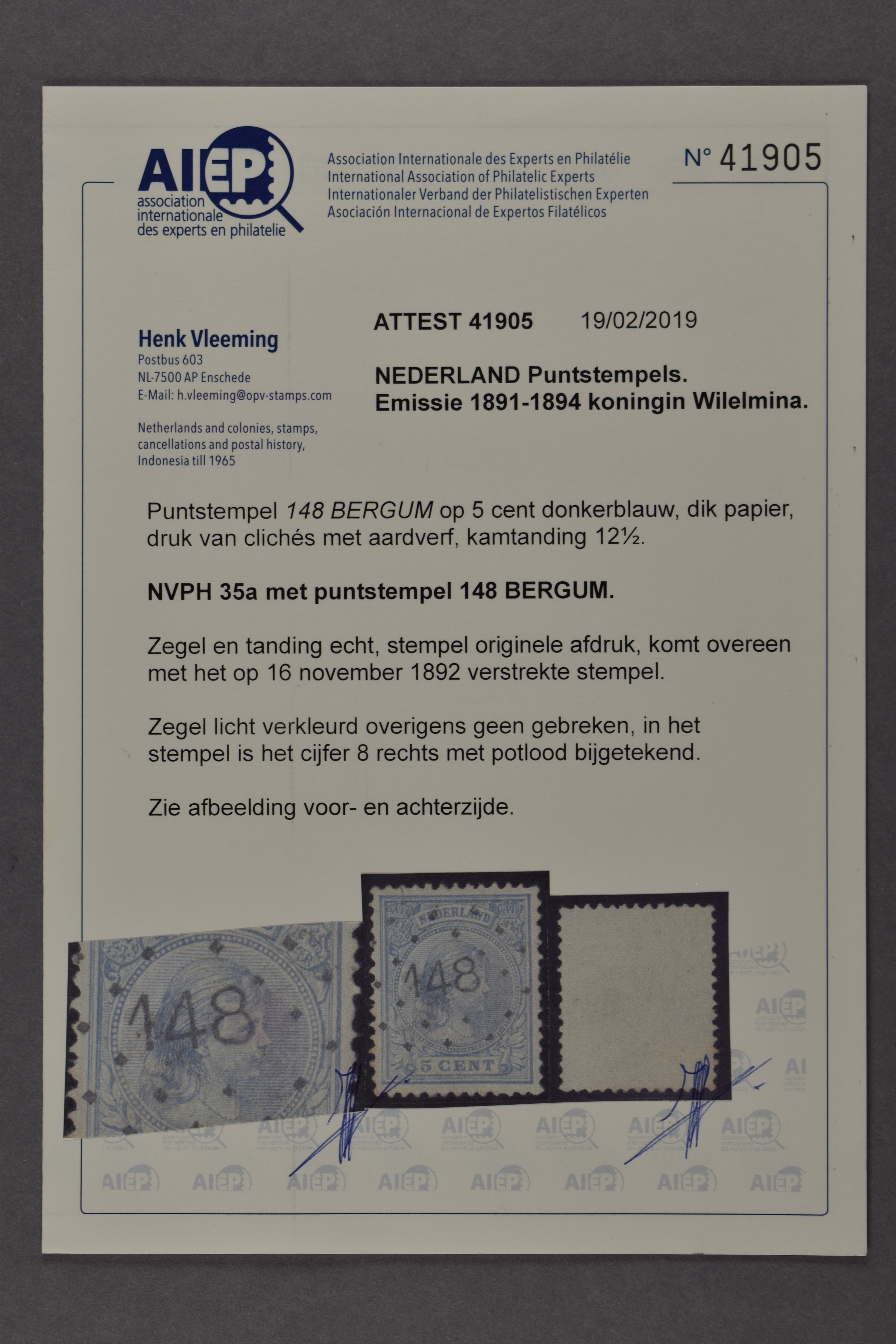 1564 o image148 = Bergum op 5 cent blauw nr. 35. Prachtex. met iets bijgetekend stempel en certificaat Vleeming (2019) € 400 (Image) (Image2) (All Images)