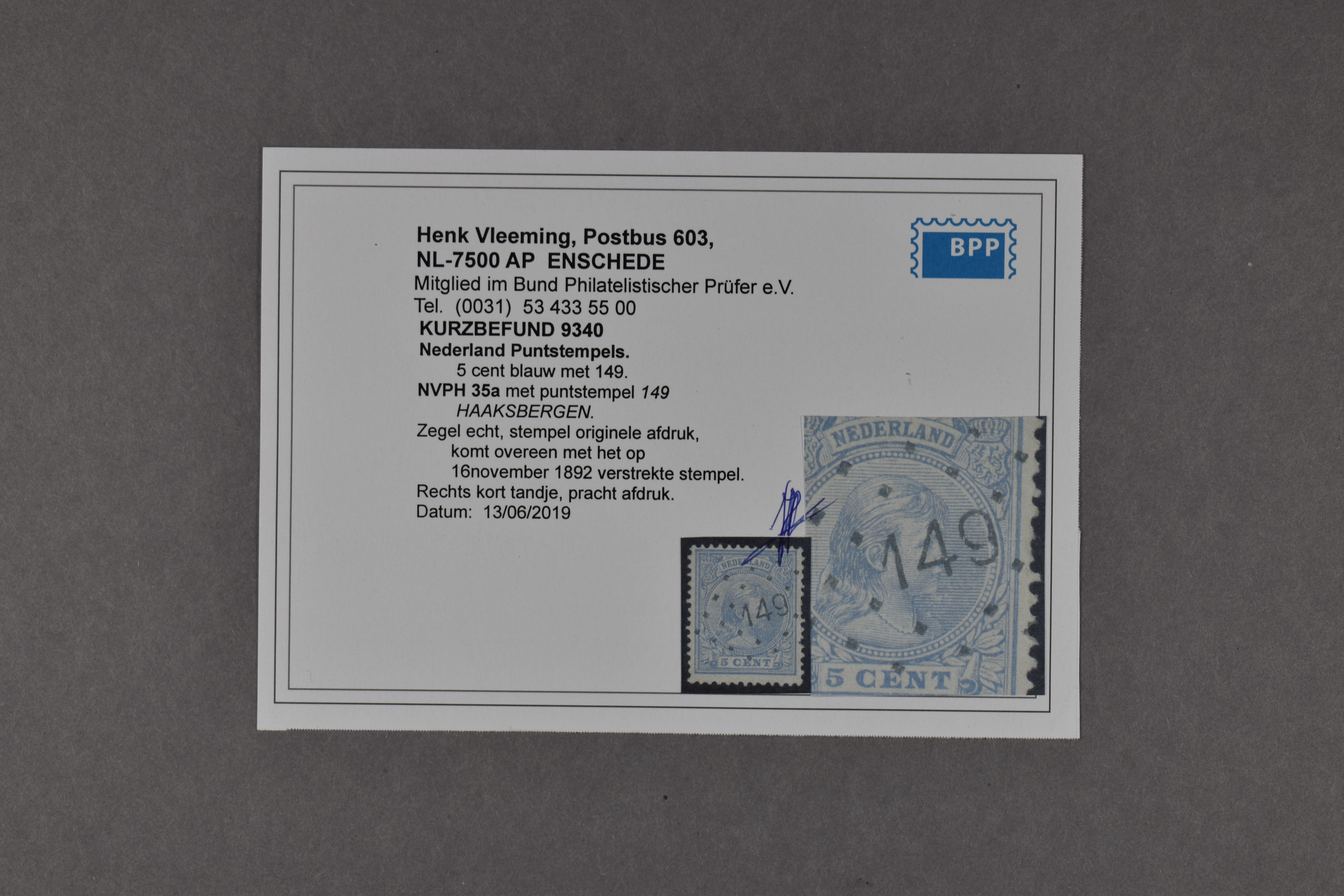 1565 o image149 = Haaksbergen op 5 cent blauw nr. 35. Zeer fraai ex. met ideale afst. en attest Vleeming (2019) € 200 (Image) (Image2) (All Images)