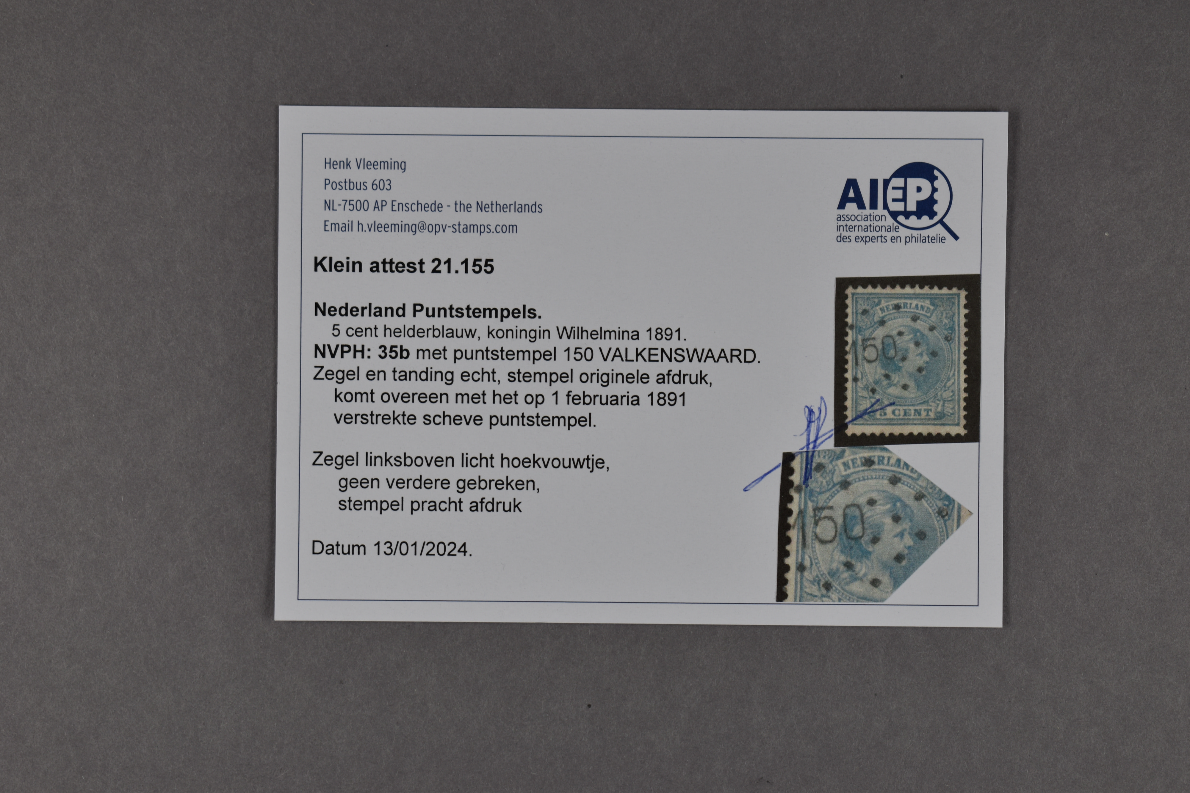 1567 o image150 = Valkenswaard op 5 cent blauw nr. 35. Beh. een miniem hoekvouwtje een prachtex. met attest Vleeming (2024) € 350 (Image) (Image2) (All Images)