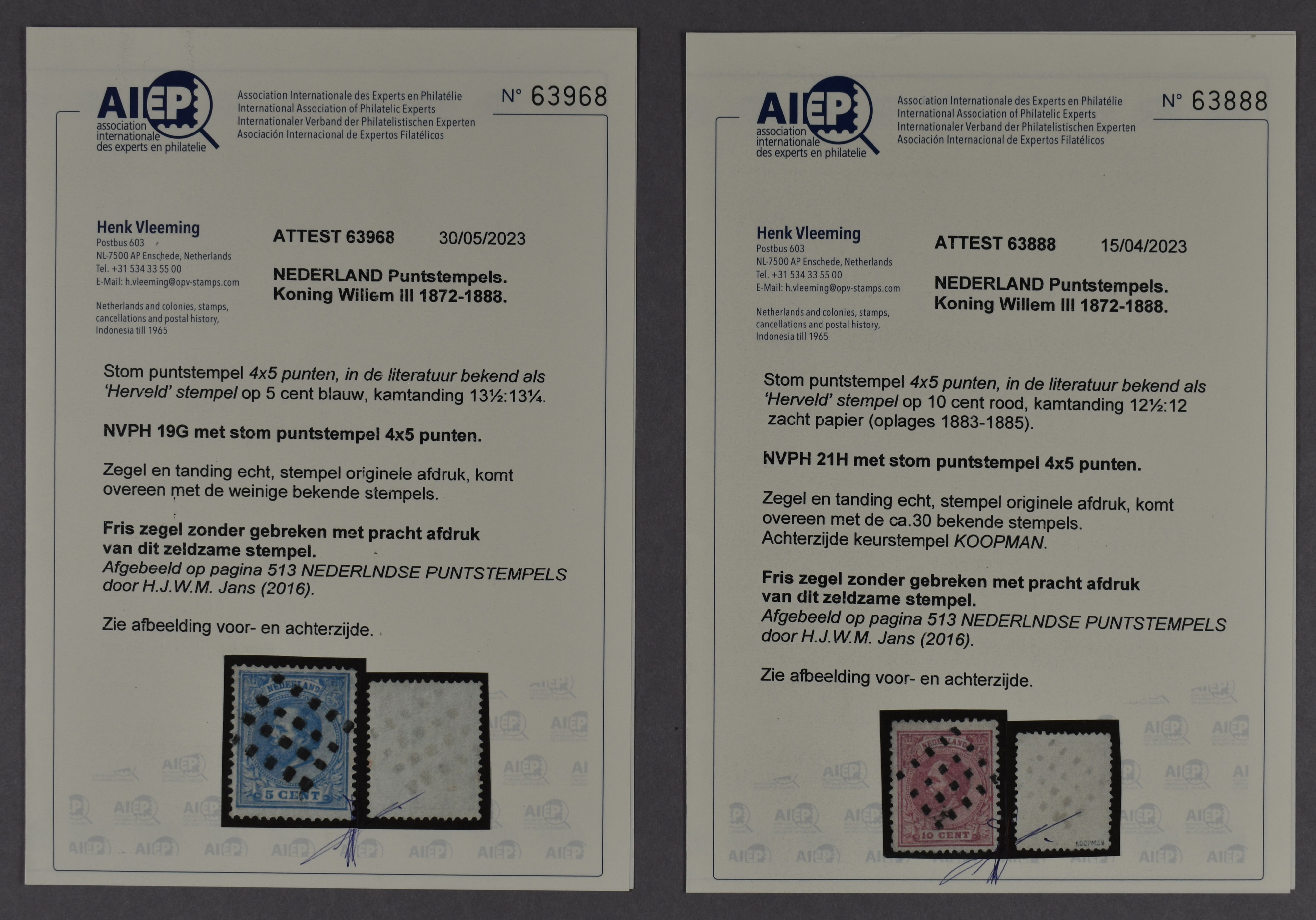1572 o image5 cent nr. 19G en 10 cent nr. 21H, beide met Stom Puntstempel 4 x 5 punten, zogenaamd "Herveld-stempel". Zeldzame prachtex. elk met certificaat Vleeming (2023) en allebei afgebeeld op pagina 513 van "Nederlandse Puntstempels" door H.J.W.M. Jans (2016) (Image) (Image2) (All Images)