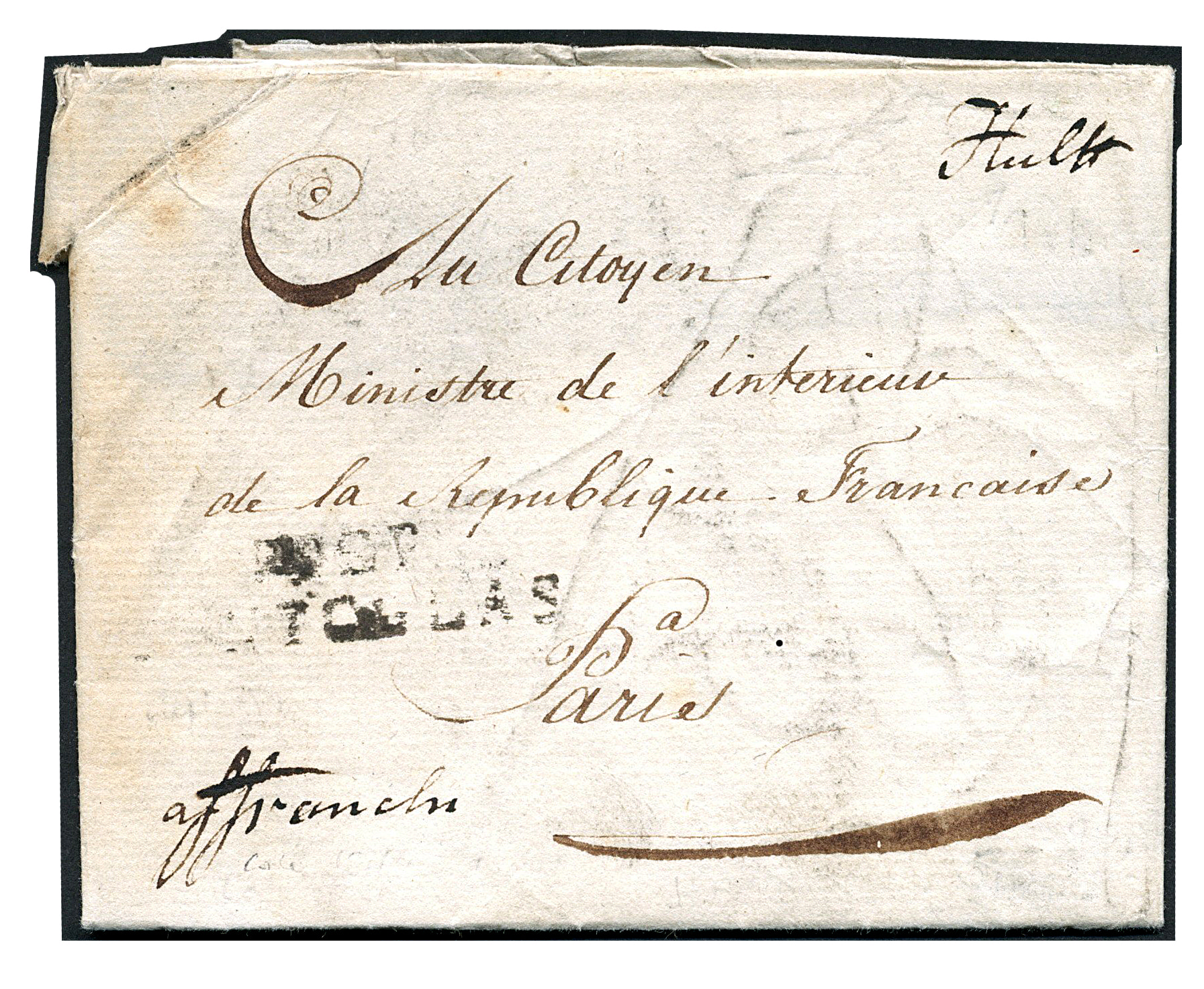 1573 on cover imageDrie mooie brieven met rechtsboven geschreven 'Hulst' (PEP1.9090-01v). Brief van 15-2-1793 van Hulst naar Sint Niklaas, port 2 sols (Hulst als postkantoor), brief van '9 Nivose 4e Année rep' (1796) via Brugge naar Gent, port 3 sols (Hulst als distributiekantoor), en brief uit Ossenisse van '5 Ventose an 8 de la Rep...' over Hulst, Sint Niklaas en Antwerpen naar Parijs met op de az. geschreven 'Aff[ranchi] 10 s [schelling]. Albumbladen bijgesloten (Image)