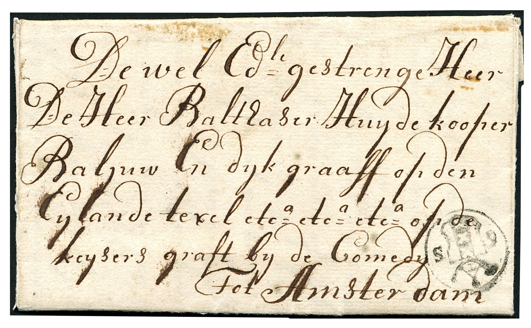 1576 on cover imageTexelse Post. Complete, frisse brief geschreven 'actum ter burg op texel' 6-3-1739 naar Amsterdam met het eerste poststempel van het Texelse kantoor te Amsterdam en daar afgestempeld (PEP1.6020-28). Zeldzaam! (Image)
