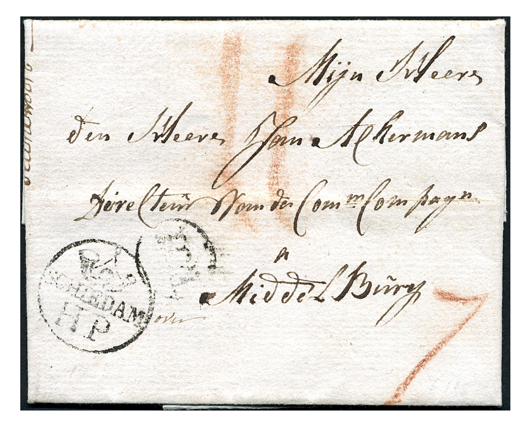 1577 on cover imageOmrande vertrekstempels w.o. met H.P. Complete brief van Schiedam 28-6-1787 (PEP1.10530-01) via Rotterdam (PEP1.10510-08) naar Middelburg, en complete brief van Schoonhoven 24-8-1796 (PEP1.10540-02) naar Schiedam. Tevens brief van Vlissingen 31-7-1809 (PEP1.9240-03) naar Delft, alsmede complete brief van Middelburg 28-12-1809 (PEP1.9130-14) naar Louvain (F) (Image)