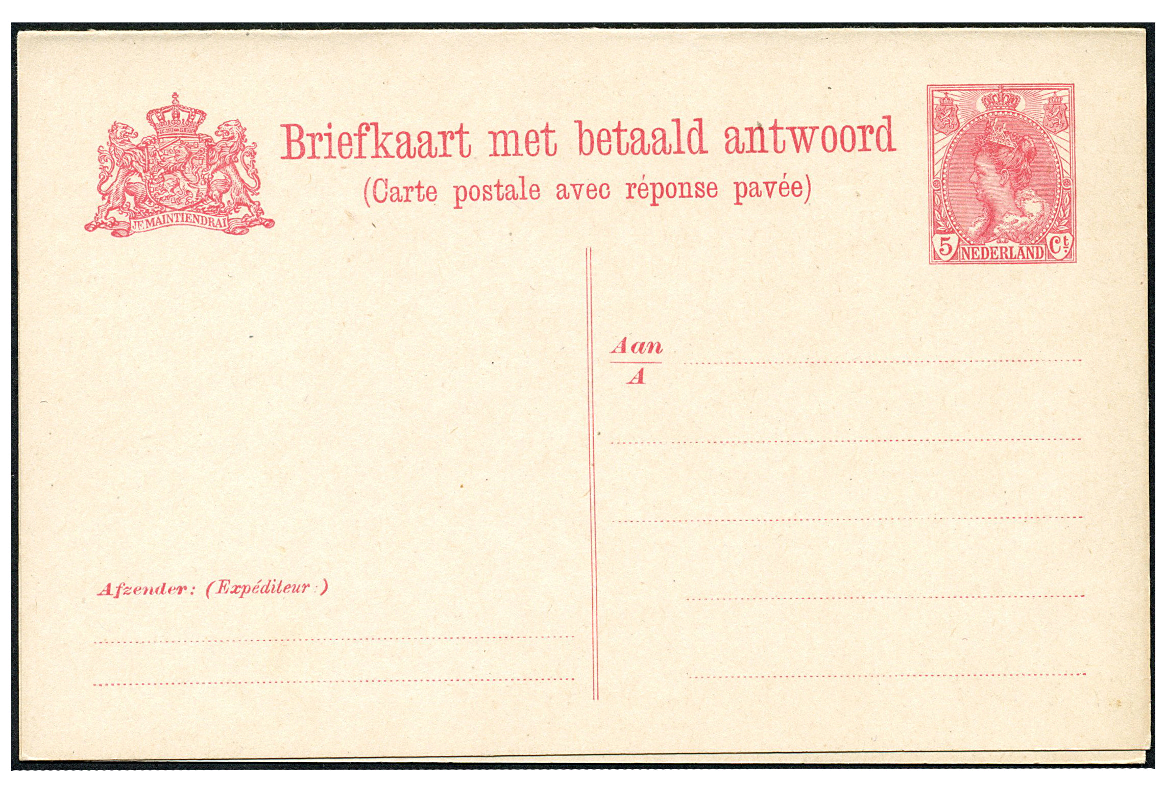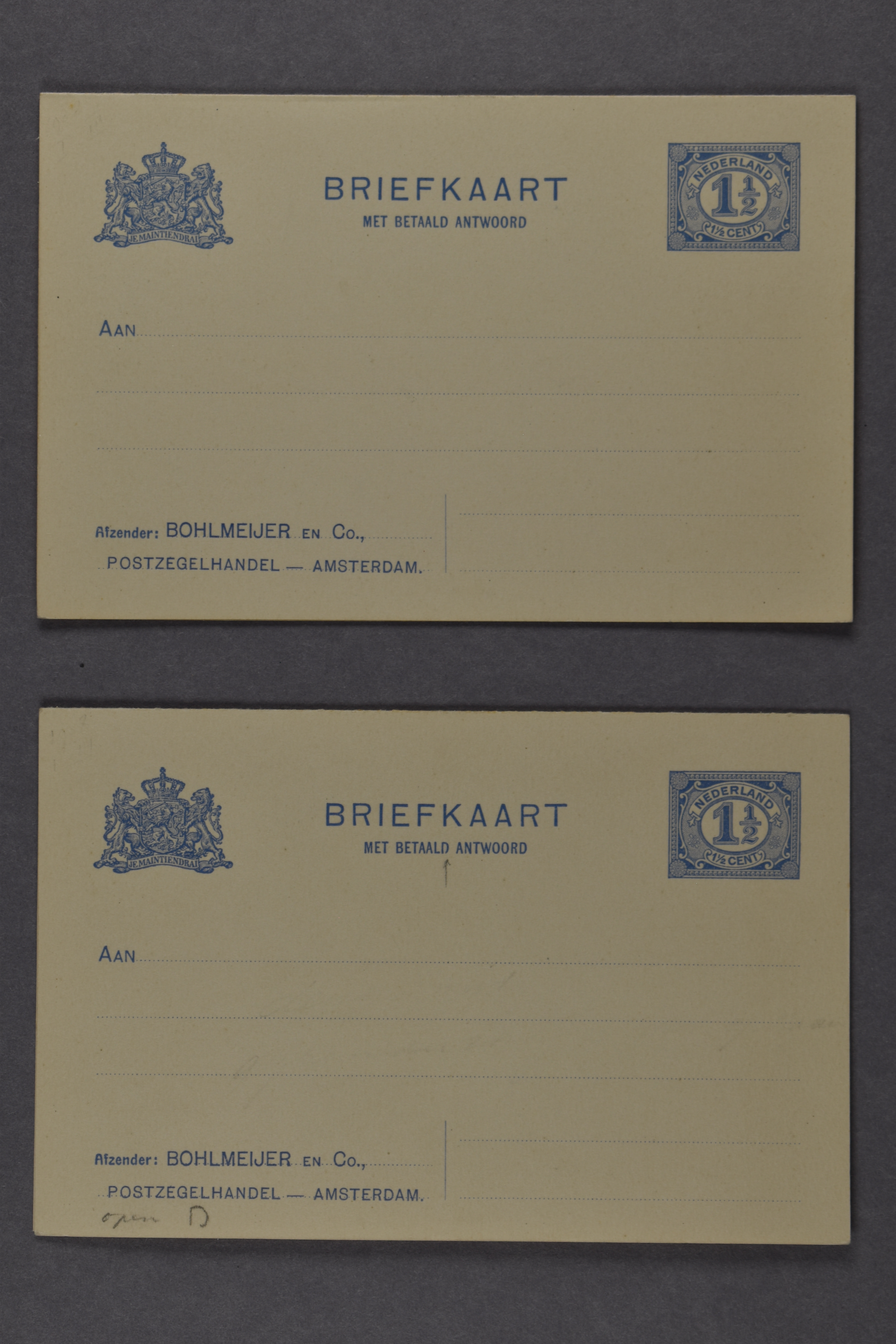 Particuliere dubbele briefkaart van 1½+1½ cent P79-II (niet in cat. 2008), twee ongebruikte prachtkaarten waarvan 1 ex. met druktoevalligheid 'Open D van BETAALD' alleen op de V-kaart (Image) (Image2)