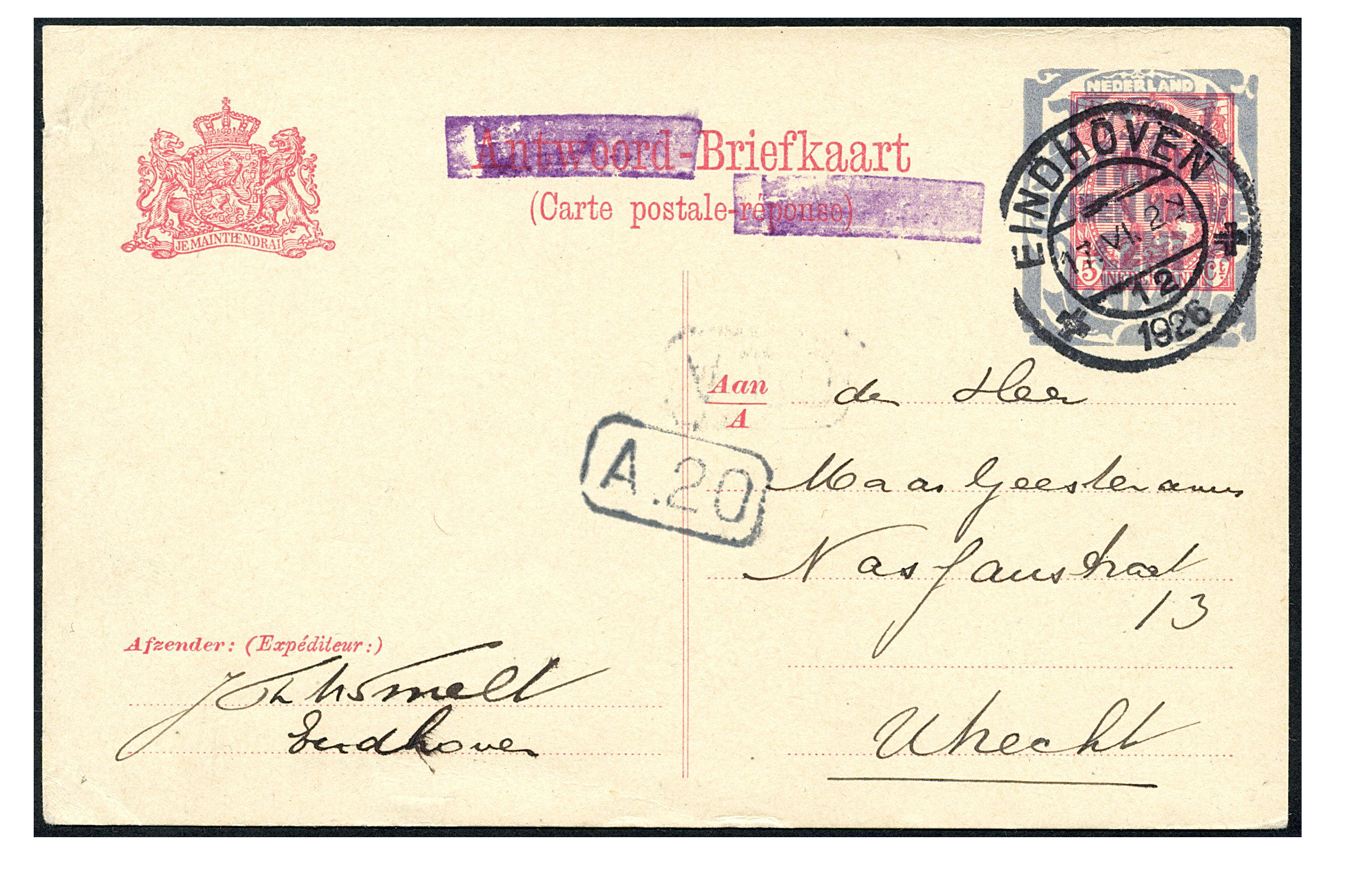Eindhovens Provisorium. Bk. als G210a op het postkantoor van Eindhoven waarschijnlijk begin juni 1926 voorzien van door ambtenaar eigenmachtig, maar te goeder trouw aangebrachte PAARSE balken, en verkocht als enkele buitenlandse